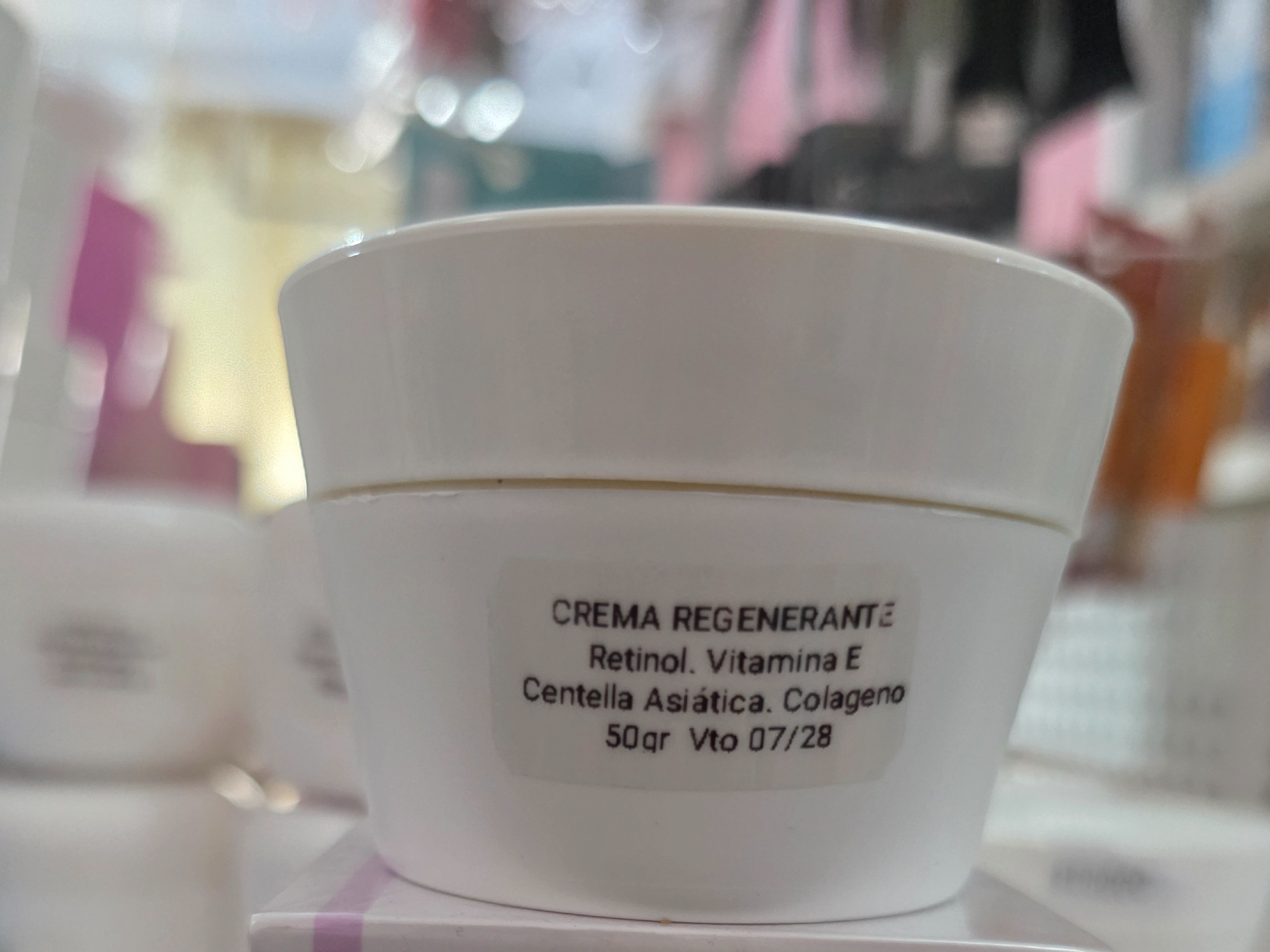 CREMA REGENERANTE X 50gr Línea Fraccionada Crema facial antiedad de textura emulgel que hidrata intensamente, mejora la firmeza y renueva la piel desde el interior gracias a su fórmula con retinol puro, centella asiática, colágeno y vitamina E. La Crema Regenerante Esencial es un tratamiento diario de última generación para pieles fotoenvejecidas, involutivas y seborreicas. Su textura emulgel permite una absorción rápida sin dejar residuos, brindando una experiencia sensorial delicada y altamente efectiva. Enriquecida con Retinol puro 2500 UI/g, esta fórmula estimula la renovación celular, mejora la textura, reduce líneas de expresión y potencia la luminosidad de la piel. La Centella Asiática actúa como reparadora intensiva, colaborando en la regeneración del tejido y devolviendo vitalidad al rostro. El colágeno y la vitamina E completan este cóctel antiage reforzando la barrera cutánea, protegiendo contra radicales libres y dejando la piel suave, hidratada y visiblemente más saludable. Hipoalergénica, sin parabenos, libre de alérgenos y clínicamente testeada, esta crema está diseñada para ofrecer resultados visibles sin comprometer la tolerancia cutánea. BENEFICIOS Hidrata en profundidad sin sensación pesada. Estimula la renovación celular con retinol puro. Mejora la textura y firmeza de la piel. Ilumina y unifica el tono. Repara el tejido dañado y fortalece la barrera cutánea. Ideal como tratamiento nocturno. ACTIVOS Retinol puro 2500 UI/g: activa la renovación celular, suaviza líneas y mejora la textura. Centella Asiática: regenera y aporta luminosidad. Colágeno hidrolizado: humecta y reafirma. Vitamina E: antioxidante, protege contra el envejecimiento prematuro. Modo de uso Aplicar sobre rostro, cuello y escote perfectamente limpios. Masajear suavemente hasta su total absorción. Se recomienda su uso nocturno. Durante el día, aplicar protector solar SPF 30 o superior OBLIGATORIO. Tipo: Rostro Función: Renovador celular / peeling Reafirmante facial / tensor Para pieles: Arrugas y/o surcos Involutivas Fotodañadas Vehículo: Crema Principio activo: Colágeno Retinol Vitamina E Centella Asiática