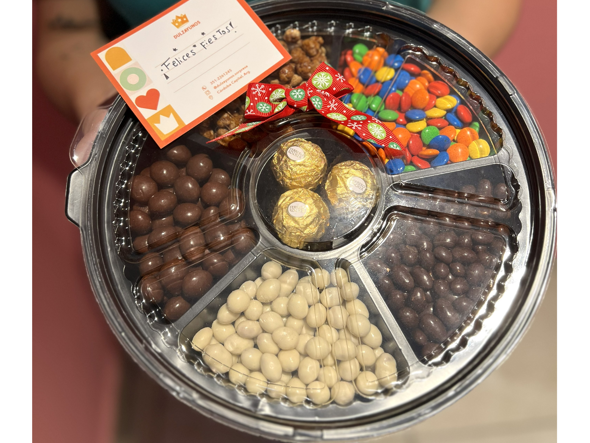 Tentación navideña, ideal para compartir! Compartir Una combinación irresistible para celebrar con mucho sabor. 🍫✨ Perfecta para compartir la mesa dulce de esa noche tan especial y seguir pidiendo deseos! Peso aproximado 600 gramos! Presentación en: 🍱Bandeja redonda con tapa transparente 🎀Decorada con moño navideño 💌Tarjeta dedicatoria personalizada Bandeja surtida con 6 variedades para compartir: 👑Trío de Bombones Ferrero Rocher 👑Garrapiñada de maní 👑Rocklets de chocolates 👑Maní bañado en chocolate blanco 👑Maní bañado en chocolate negro 👑Almendras cubiertas en chocolate negro Detalle para regalar y disfrutar en estas fiestas. 🍫🎄 Consultá precio por más 10 unidades!! Presentaciones Seleccioná una opción.1 unidad$34.600$28.600 17% OFF 3 unidades$99.000$78.600 21% OFF Complementos para tu pedido Agregá items adicionales a tu pedido. Agrandá tu regalo navideño Seleccioná las opciones que quieras.Budín Premium de vainilla relleno con dulce de leche Steinhauser 4 unidades en stock $7.500Almendras bañadas en chocolate con leche (en cajita) 4 unidades en stock $7.600Maní bañado en chocolate semiamargo (en cajita) 4 unidades en stock $6.900Pan dulce con chips de chocolate$8.600Bolita navideña con dulces (sin personalizar)$8.500Bolita navideña con dulces (Personalizada con nombre)$11.500Cookie navideña artesanal$4.850🤍Chocolate ENORME BON O BON 160gr 2 unidades en stock $12.650Huevo de chocolate COFLER BLOCK 56gr Última unidad $7.850$6.500 17% OFF 🤍Alfajores Chammas x6 3 unidades en stock $6.850🤍Chocolate COFLER 55gr$6.500🤍Chocolate COFLER BLOCK 55gr$4.650🤍Chocolate Dubai Cofler EL VIRAAAAL! 2 unidades en stock $6.250🤍Huevito Kinder ¡sorpresa!$3.950$3.650 8% OFF Observaciones 0 / 150 Encontrá productos relacionados LOW COST (14)