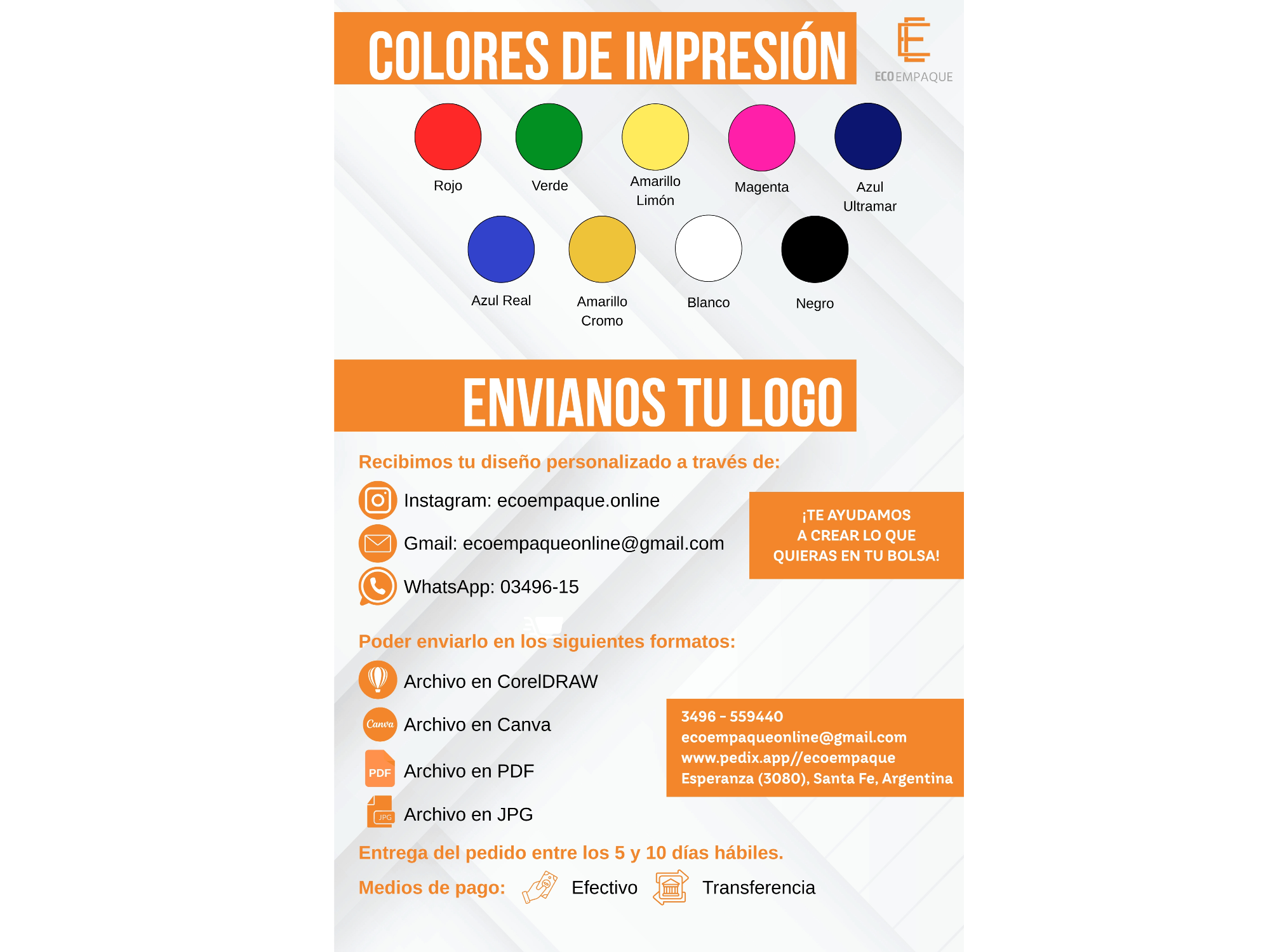 Bolsas personalizadas con tu logo. Si querés otro color de bolsas… ¡Consultanos! Para confirmar el pedido se debe abonar el 50% del total de la compra. El tiempo de entrega es de 5 a 10 días hábiles. Cuando finalices la compra envianos tu logo por WhatsApp. Envíos en la ciudad de Esperanza SIN CARGO. Los envíos fuera de la ciudad quedan a cargo del comprador.
