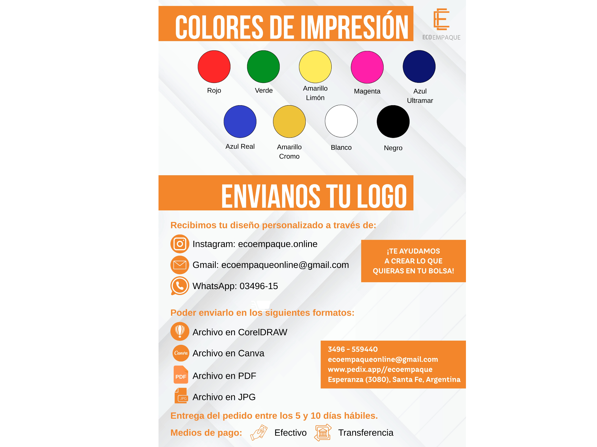 Bolsas personalizadas con tu logo. Si querés otro color de bolsas… ¡Consultanos! Para confirmar el pedido se debe abonar el 50% del total de la compra. El tiempo de entrega es de 5 a 10 días hábiles. Cuando finalices la compra envianos tu logo por WhatsApp. Envíos en la ciudad de Esperanza SIN CARGO. Los envíos fuera de la ciudad quedan a cargo del comprador.
