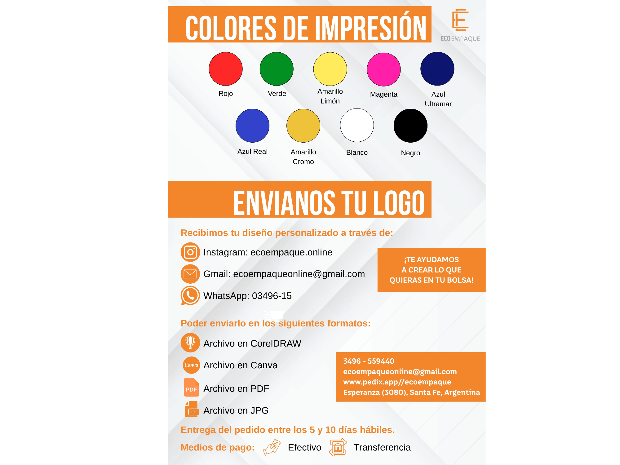 Bolsas personalizadas con tu logo. Si querés otro color de bolsas… ¡Consultanos! Para confirmar el pedido se debe abonar el 50% del total de la compra. El tiempo de entrega es de 5 a 10 días hábiles. Cuando finalices la compra envianos tu logo por WhatsApp. Envíos en la ciudad de Esperanza SIN CARGO. Los envíos fuera de la ciudad quedan a cargo del comprador.