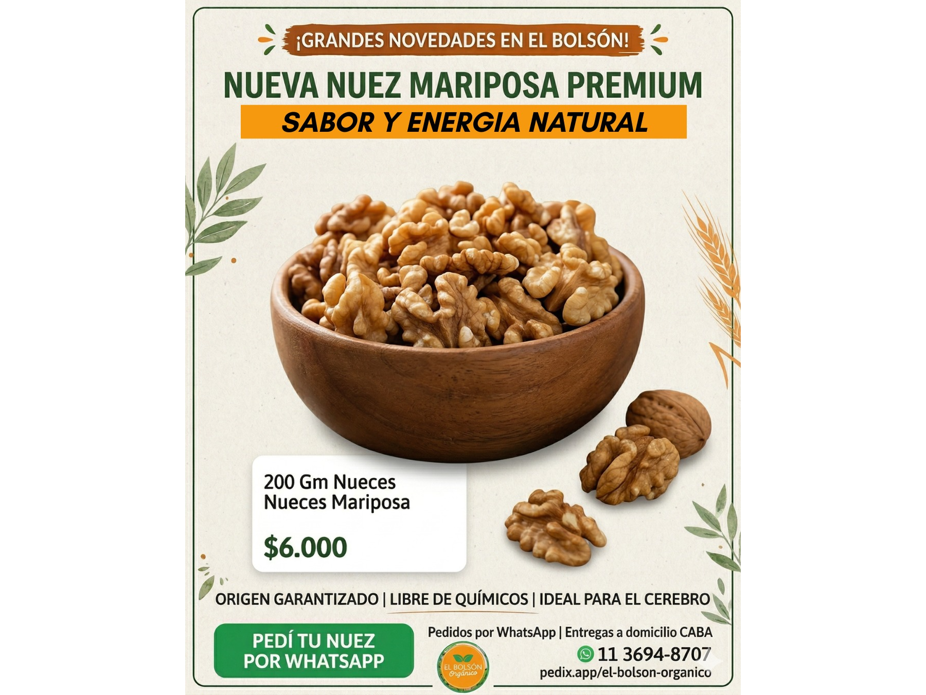 NUECES/ARROZ/HARINAS/ SEMILLAS Compartir por WhatsApp Copiar enlace 200 Gm Nueces Mariposa $6.000 1/2 kg Arroz 🍚 Doble Orgánico $2.500 1/2 kg Avena extra Fina $2.500 1/2 Kg De Avena Gruesa $2.500 1/2 kg Avena instantánea $2.500 1/2 kg De Lentejon $4.000 1/2 Kg Semillas De Quinua Orgánicas $9.990 1/2 kg De Lentejas $3.500 1/2 Kg Arroz 🍚 integral $2.800 1/2 kg De Garbanzos $3.500 1/2 kg Porotos Negro $3.500