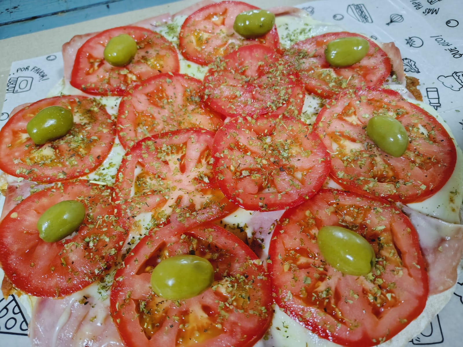Masa casera, mozzarella, jamón, tomates y aceitunas