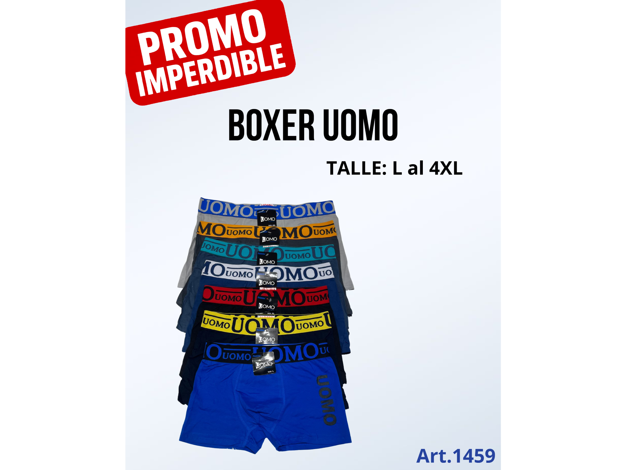 DOCENA BOXER UOMO (TIRANO) Compartir por WhatsApp Copiar enlace BOXER UOMO MARCA TIRANO LA DOCENA CONTIENE (2 unidades talle M , 2unidades talle L, 2 unidades talle XL, 2unidades talle 2XL , 2 unidades talle 3xl , 2 unidades 4 xl) Presentaciones Seleccioná las opciones que quieras.BOXER ESTAMPADOS Docena boxer UOMO LISO ( TIRANO) $22.900BOXER LISOS Docena boxer UOMO (TIRANO) $22.900 Observaciones 0 / 150 Encontrá productos relacionados BÓXER HOMBRE (7)