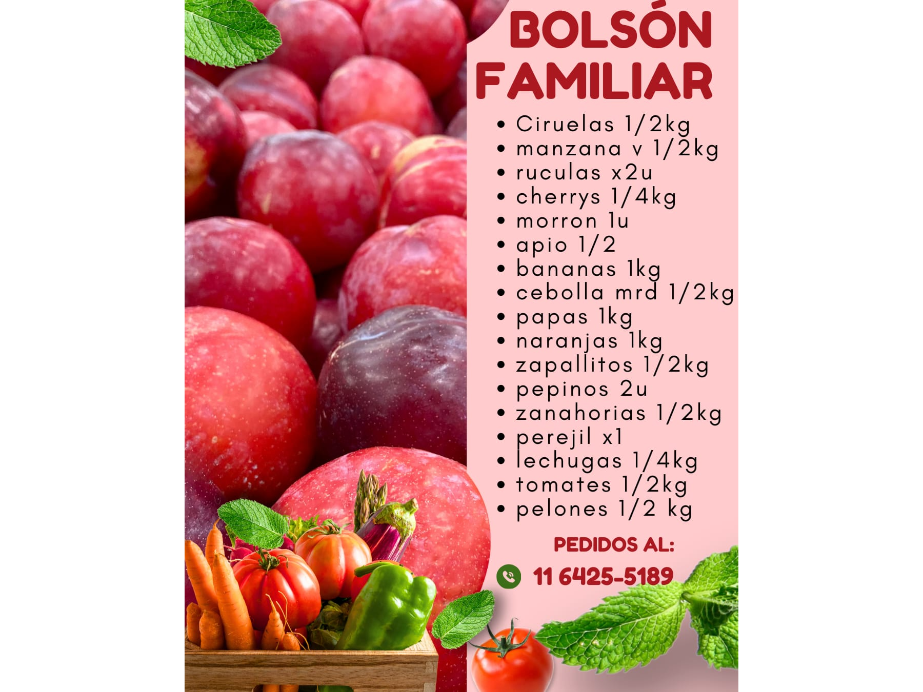 BOLSONES Compartir por WhatsApp Copiar enlace BOLSON FAMILIAR VERDURA Bolson FRUTAL Otros BOLSON FAMILIAR (2) BOLSÓN FAMILIAR $32.900 BOLSON FAMILIAR + MAPLE $44.900 VERDURA (2) BOLSON DE VERDURAS $30.900 VERDURA + MAPLE 30u $42.400 Bolson FRUTAL (1) BOLSON TUTIFRUTI ( FRUTAL ) $38.900 Otros (2) BOLSÓN PARA 2 $27.900 BOLSÓN PARA 2 + MAPLE x30 $39.400