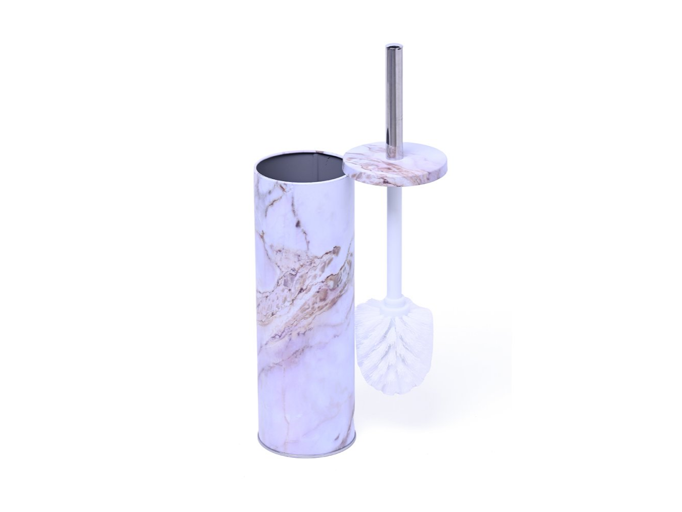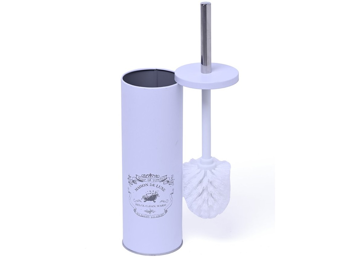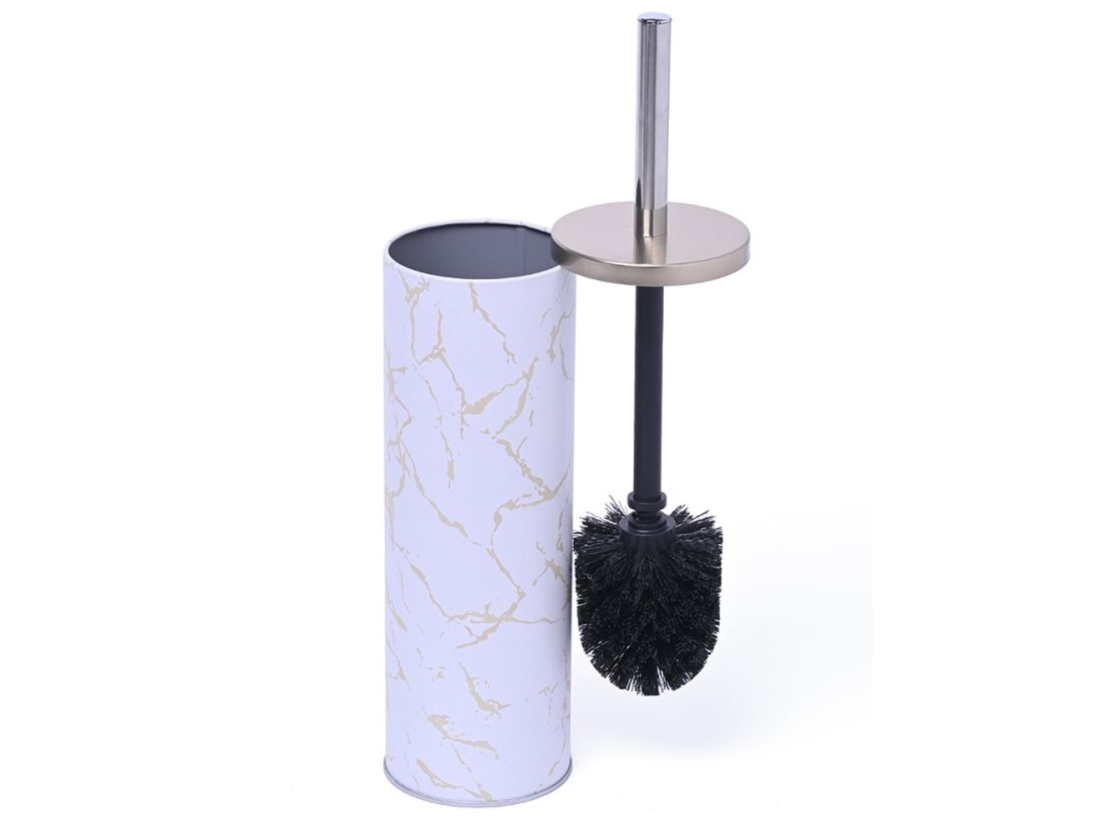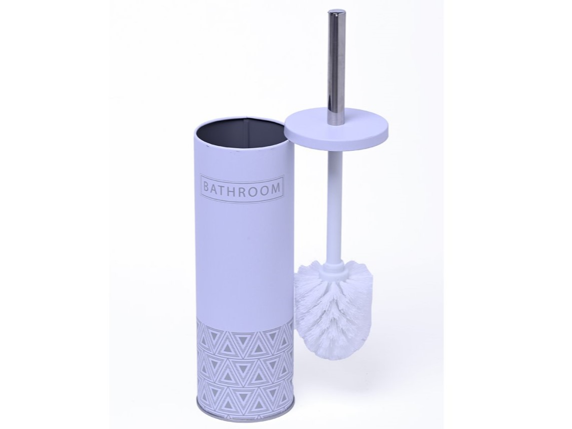 Cepillo limpia inodoro fabricado en plástico, con mango metálico.