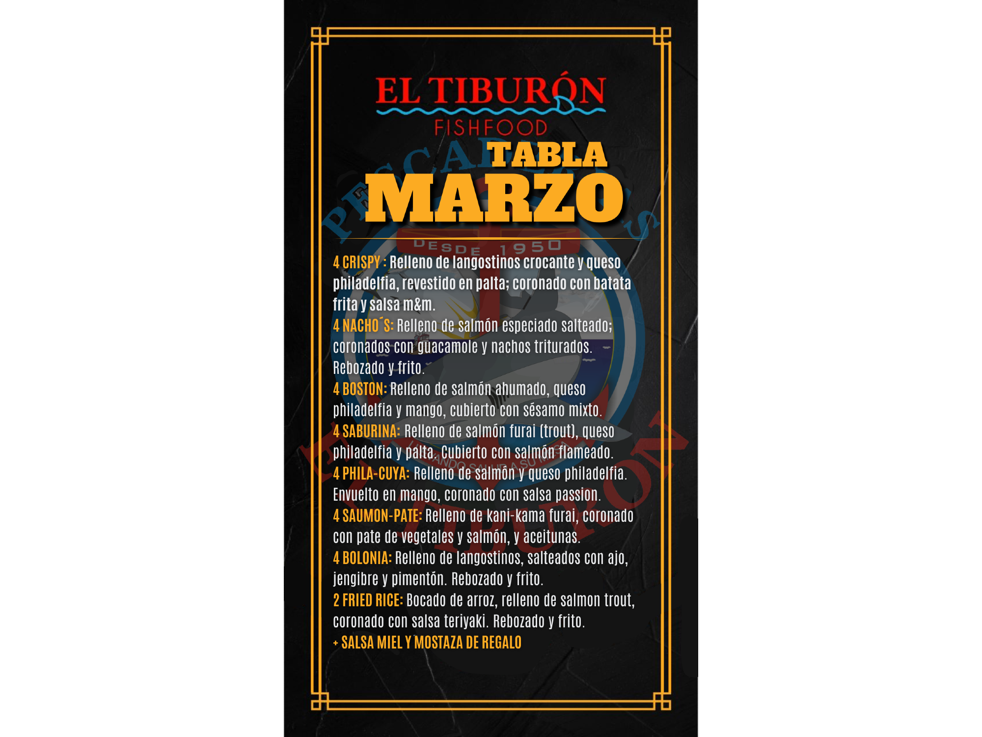 (695) TABLA MARZO x30 PIEZAS Compartir por WhatsApp Copiar enlace 4 Crispy roll + 4 Boston + 4 Phila-Cuya + 4 Bolonia +4 Nacho´s + 4 Saburina + 4 Saumon-Pate + 2 Fried Rice +SALSA DE MIEL Y MOSTAZA DE REGALO$49.900 Observaciones 0 / 150