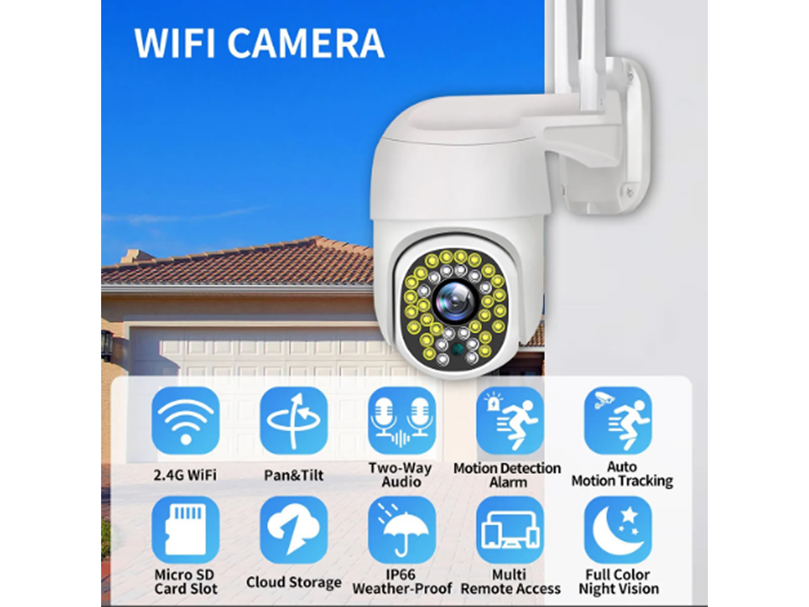 admite visión nocturna a todo color: la cámara de seguridad admite visión nocturna a todo color y visión nocturna en blanco y negro, admite grabación de detección de movimiento, reconocimiento de objetos, gritos de alarma. Lente gran angular: cámara exterior equipada con CMOS, admite zoom digital múltiple, con una lente gran angular, no solo una imagen clara y no deja un ángulo muerto, para evitar la incapacidad vea el rostro de la situación. Enlace a múltiples pantallas: Soporte inalámbrico para cámaras exteriores y conexión de software, se puede utilizar con otras cámaras para vincular múltiples pantallas, para satisfacer las necesidades de monitoreo de todo el hogar. Ajuste universal: la cámara exterior adopta un diseño de doble cabezal, puede ajustar el ángulo horizontal y el ángulo al mismo tiempo, la horizontal se puede ajustar 350 grados, inclinación ajustable 90 grados. Función de punto de acceso: cámaras de seguridad WiFi con función de punto de acceso, incluso si no están insertadas en la tarjeta de memoria, a través de la aplicación del teléfono móvil también logran la monitorización en tiempo real y la reproducción de vídeo, alta ganancia