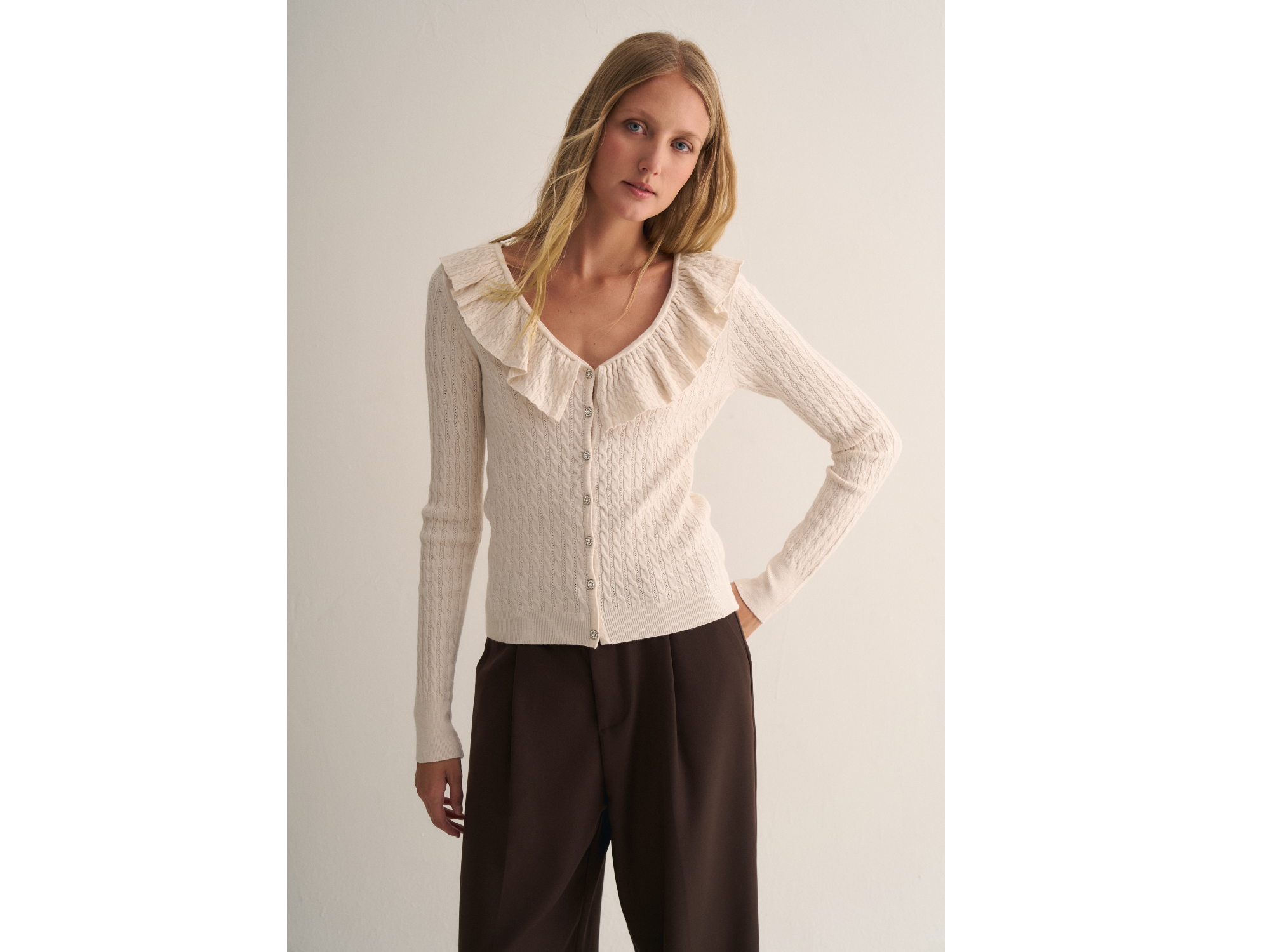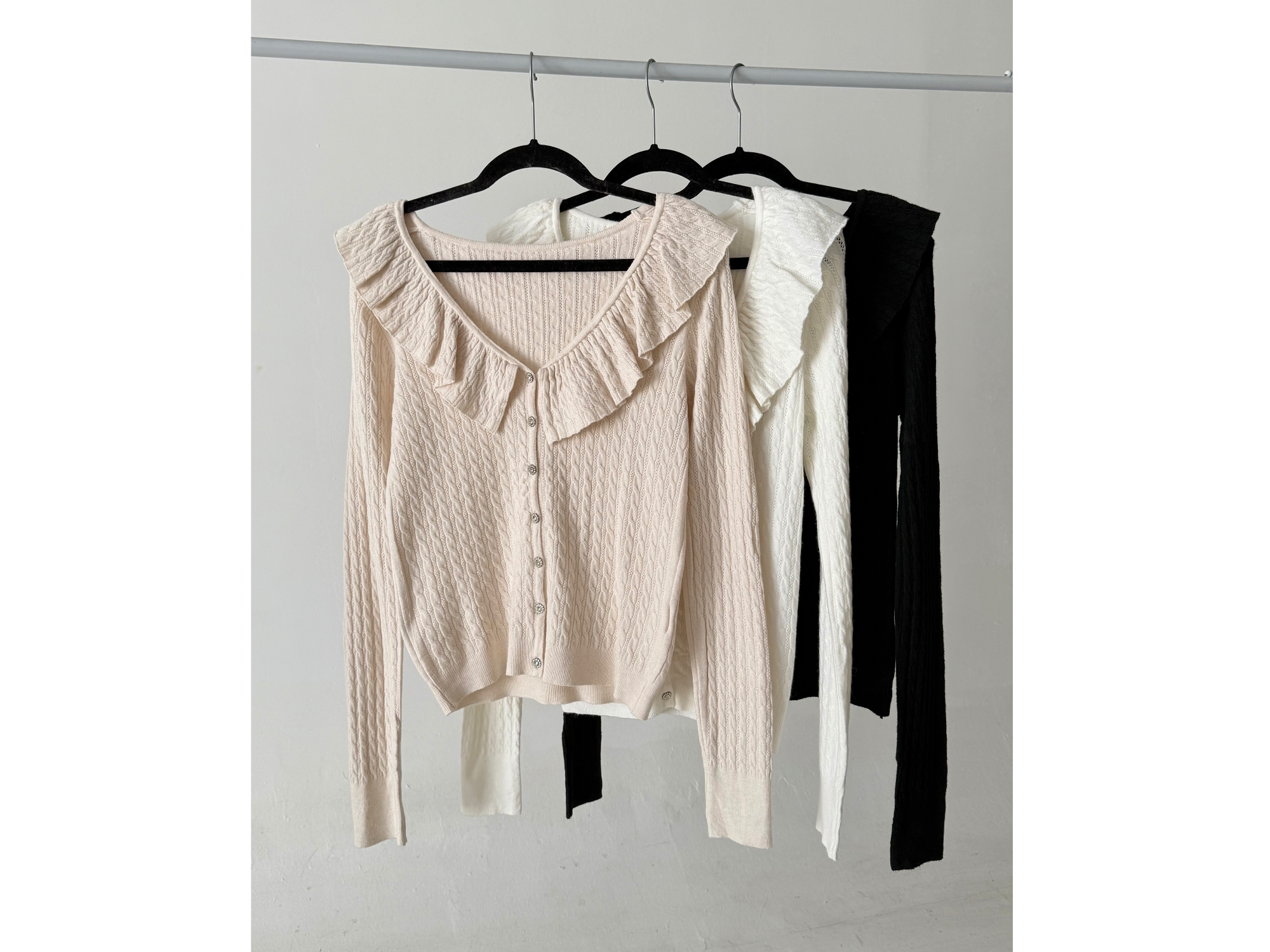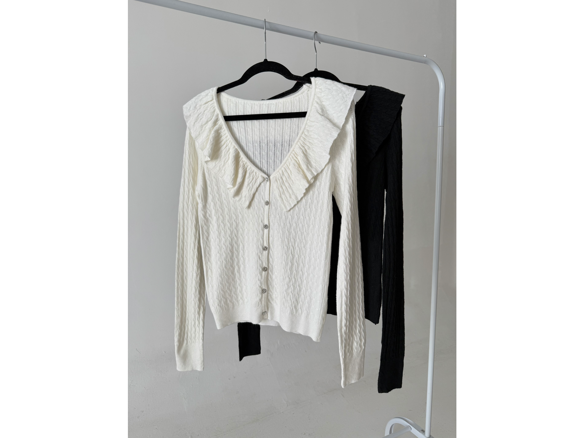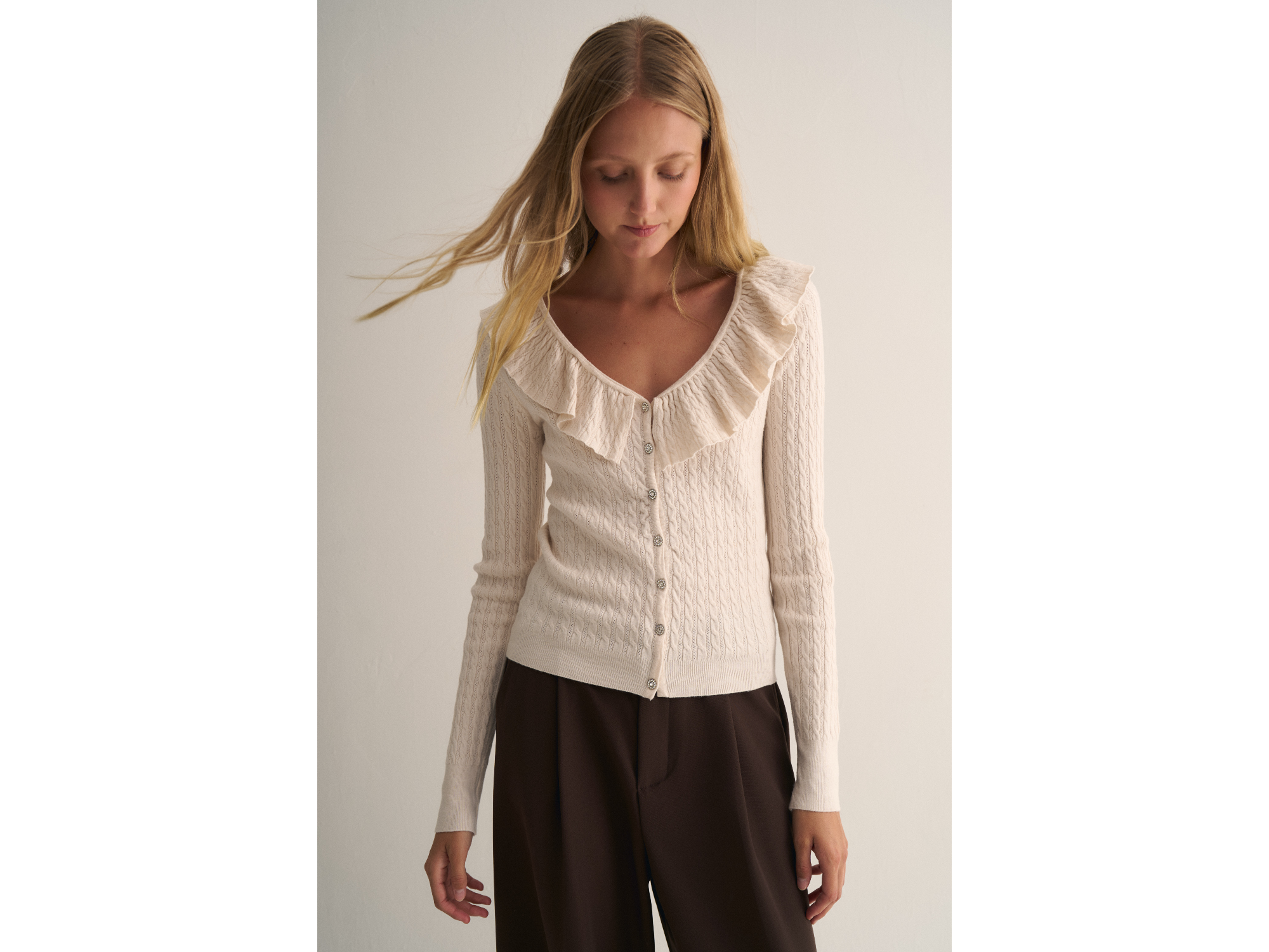 Cardigan trenzado con volado en el cuello TALLE UNICO MEDIDAS: 41 CM ANCHO DE SISA APROX. 52 CM LARGO APROX. COLORES: BEIGE, BLANCO Y NEGRO