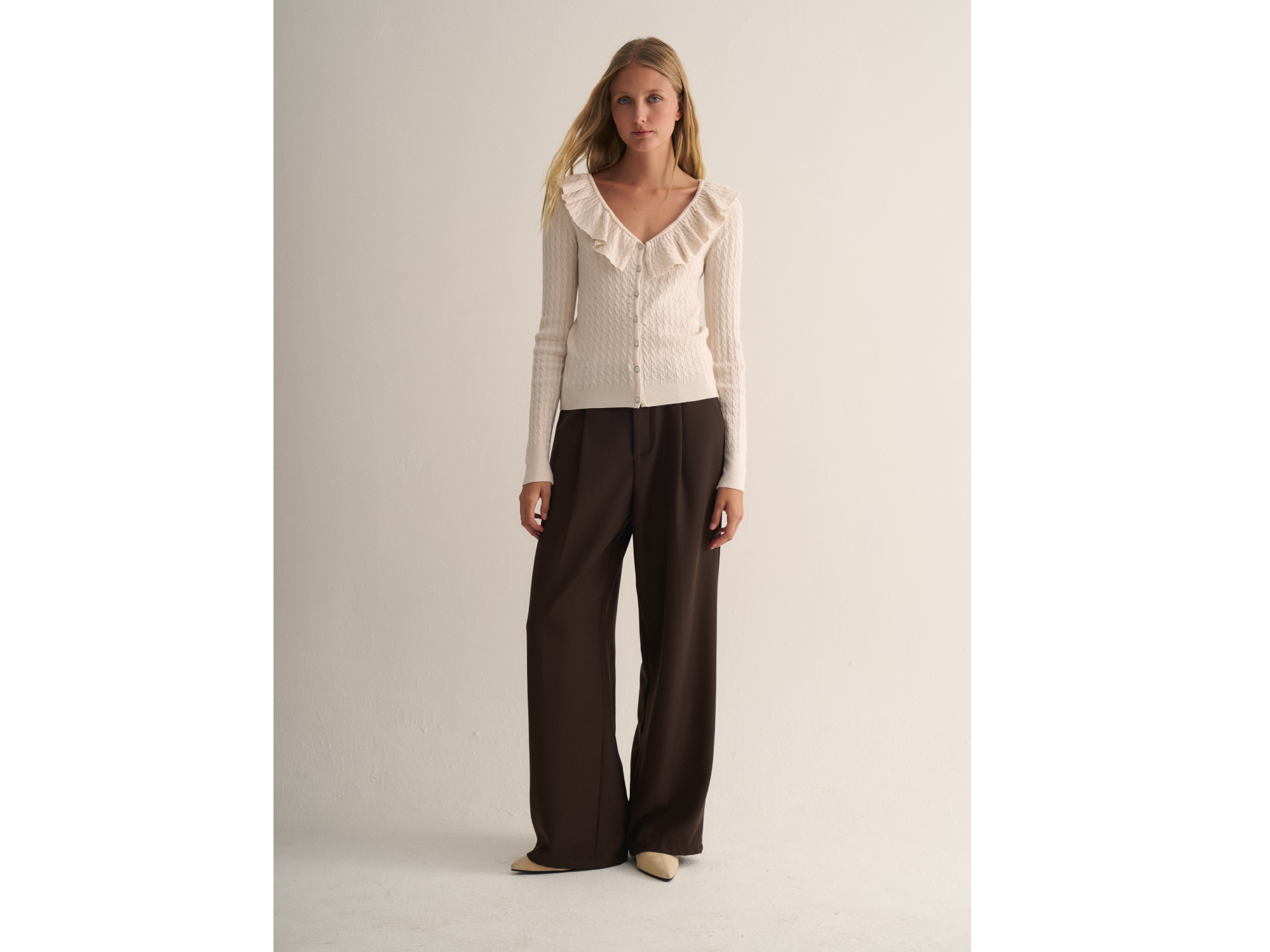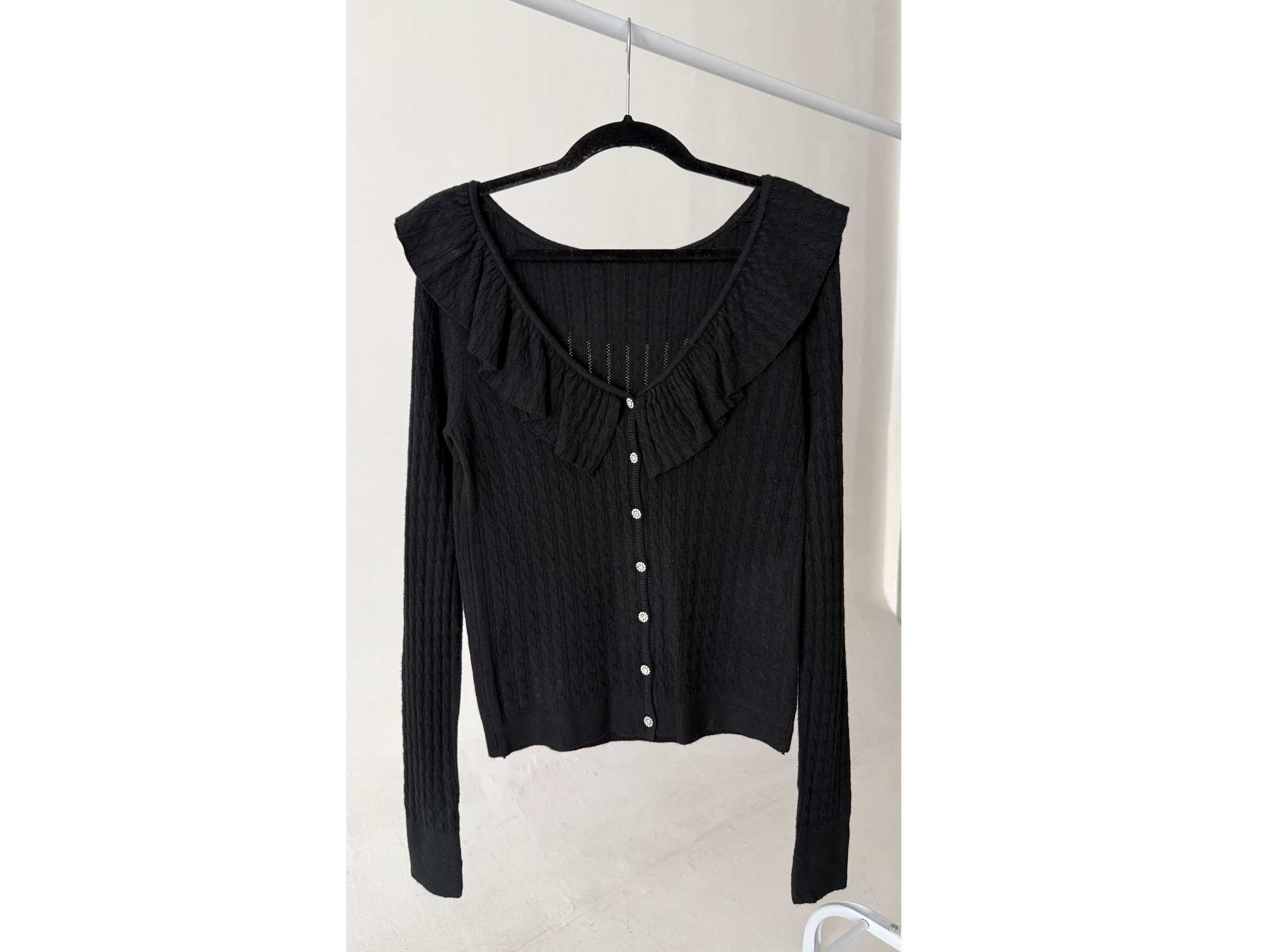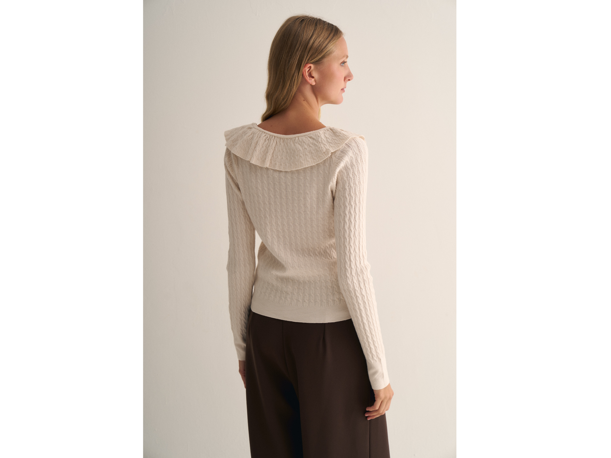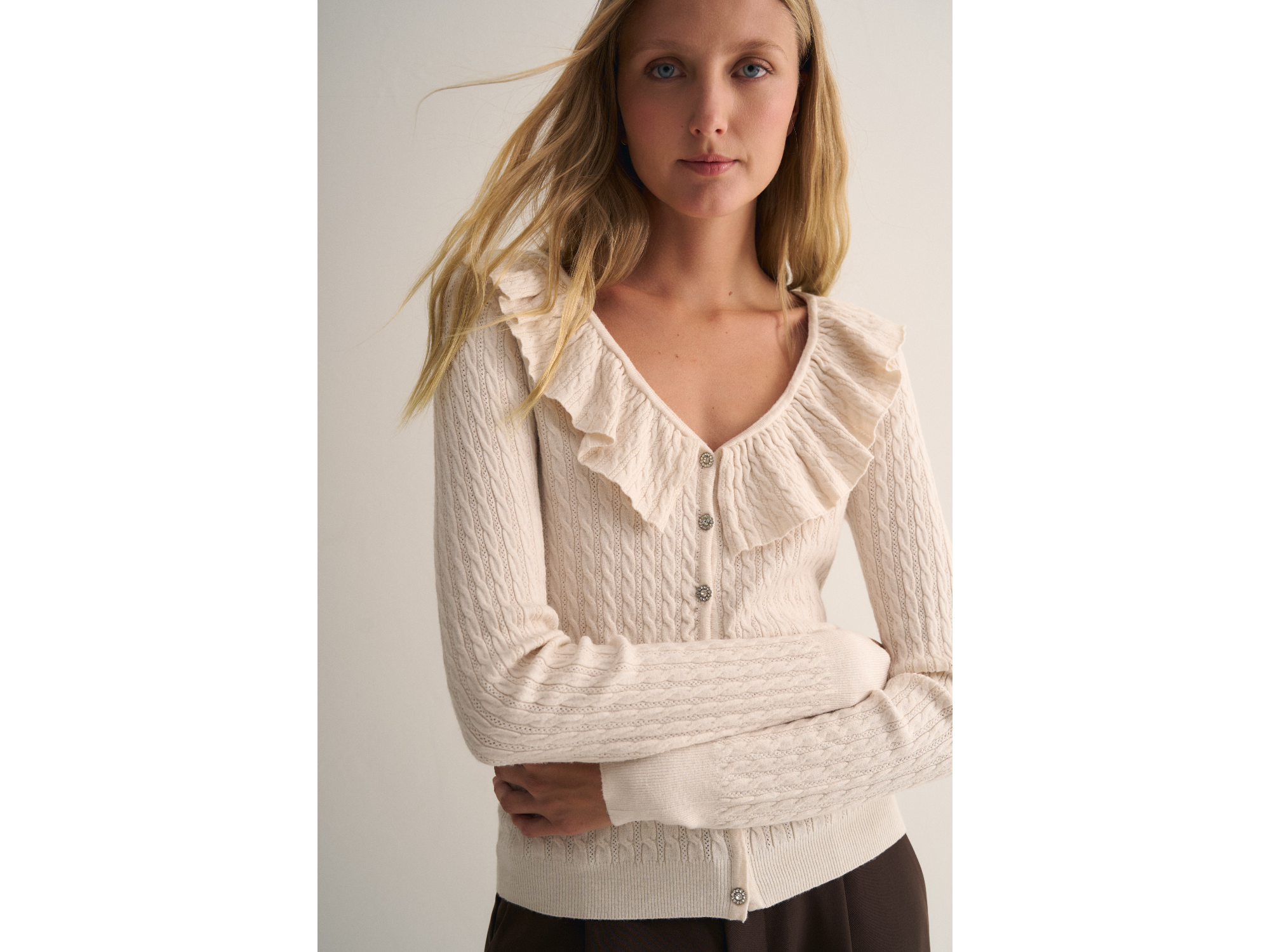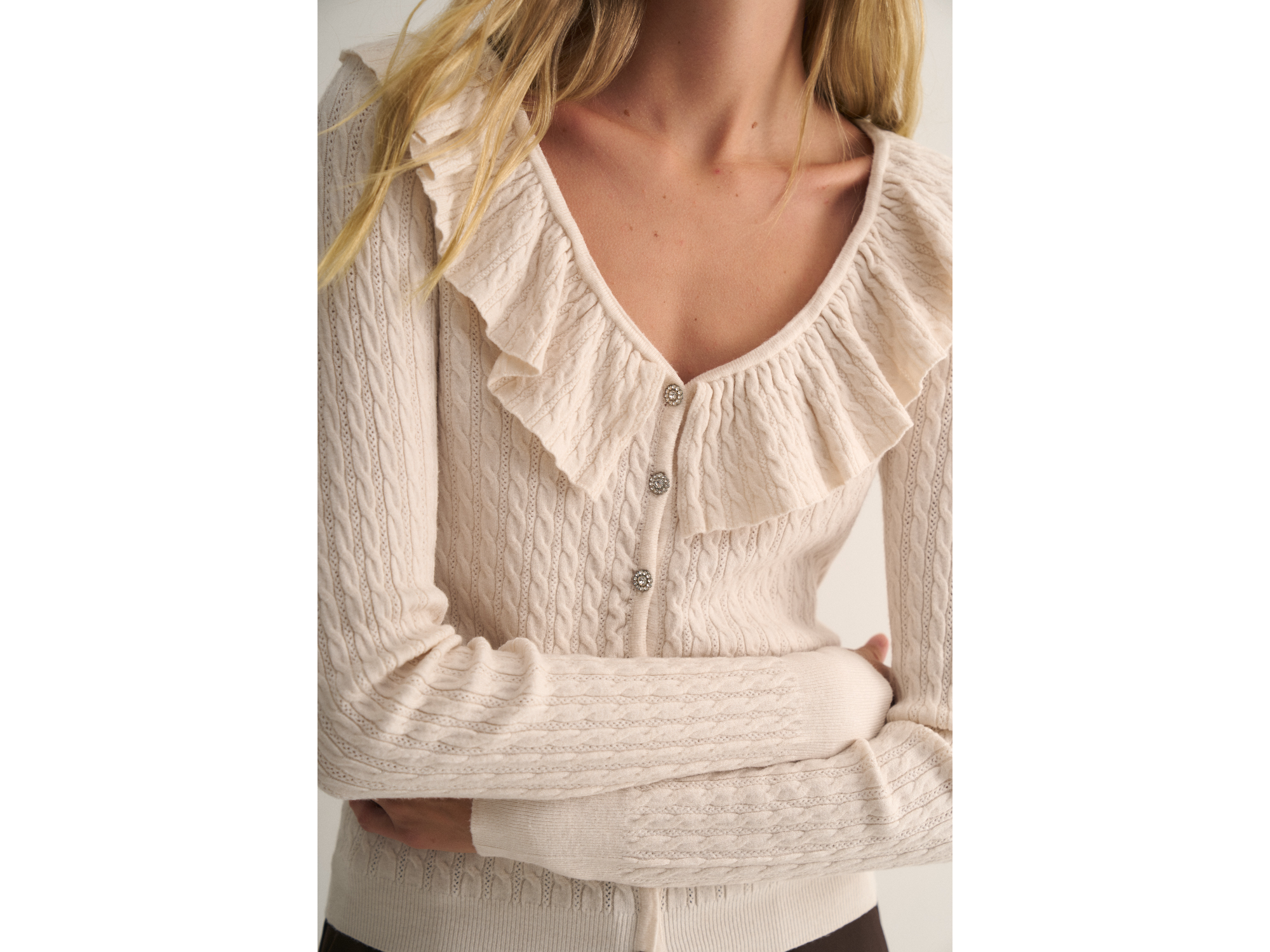 Cardigan trenzado con volado en el cuello TALLE UNICO MEDIDAS: 41 CM ANCHO DE SISA APROX. 52 CM LARGO APROX. COLORES: BEIGE, BLANCO Y NEGRO