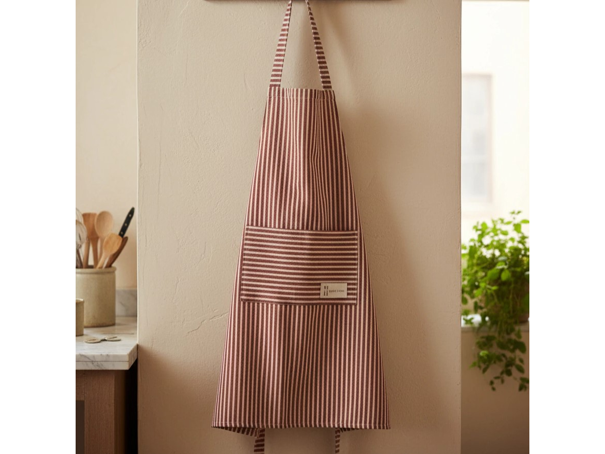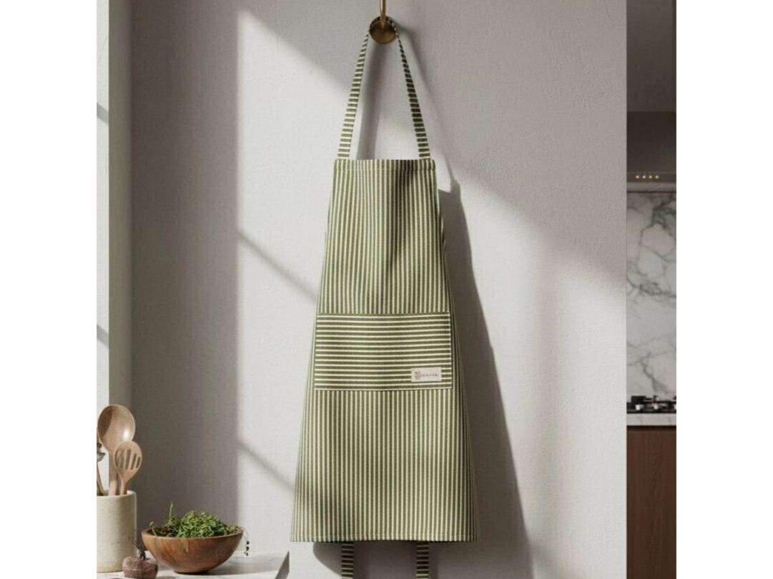Delantal confeccionado en tela tipo lona, 100% poliéster y resistente a las manchas (no impermeable). Disponible en diseños rayados marrón, verde, ladrillo y verde azulado (según disponibilidad). Cuenta con bolsillos delanteros y lazo para ajustar a la cintura