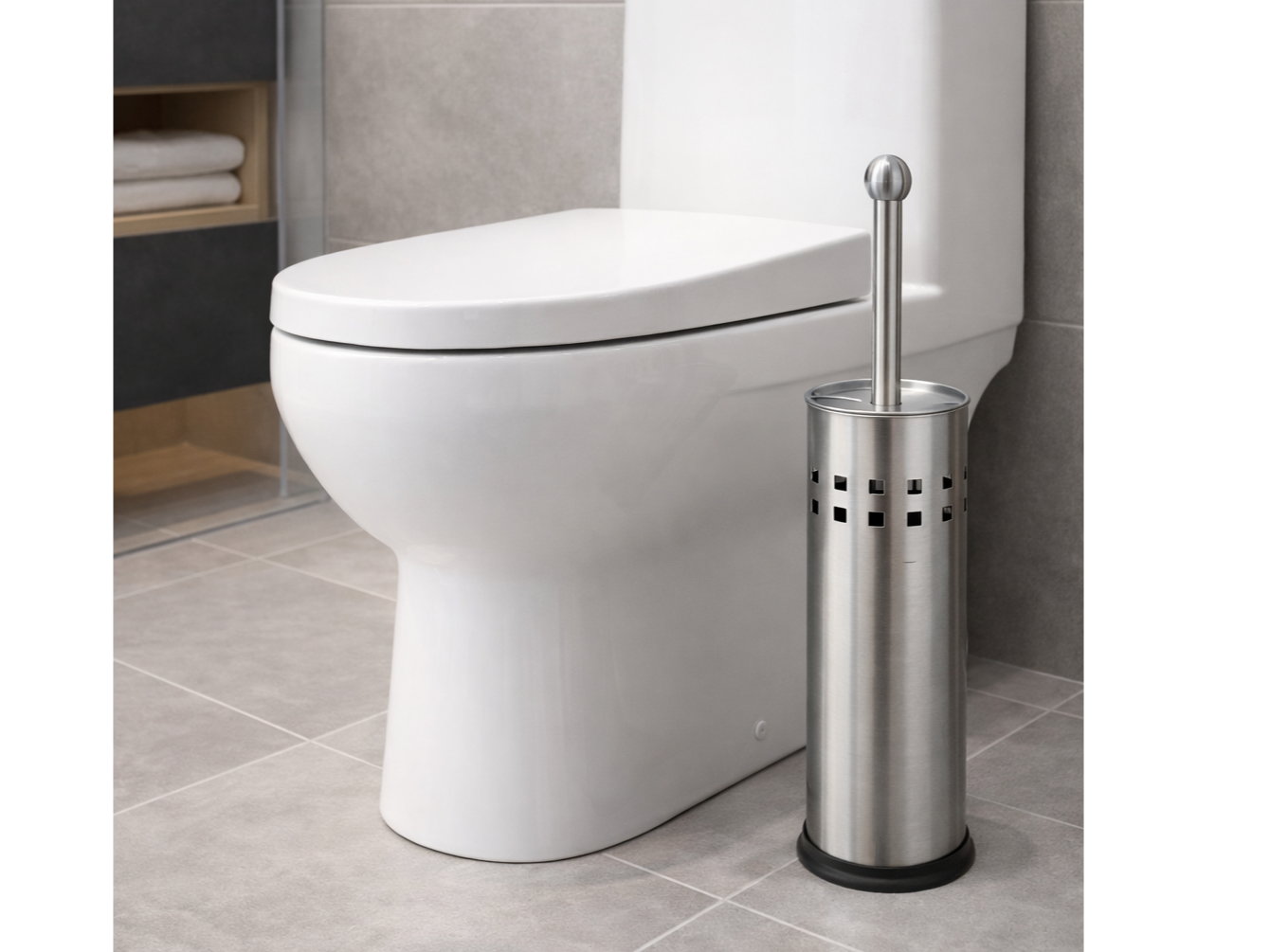 Cepillo plástico, con mango metálico plateado. Incluye también el contenedor metálico plateado, con orificios que favorecen el secado.
