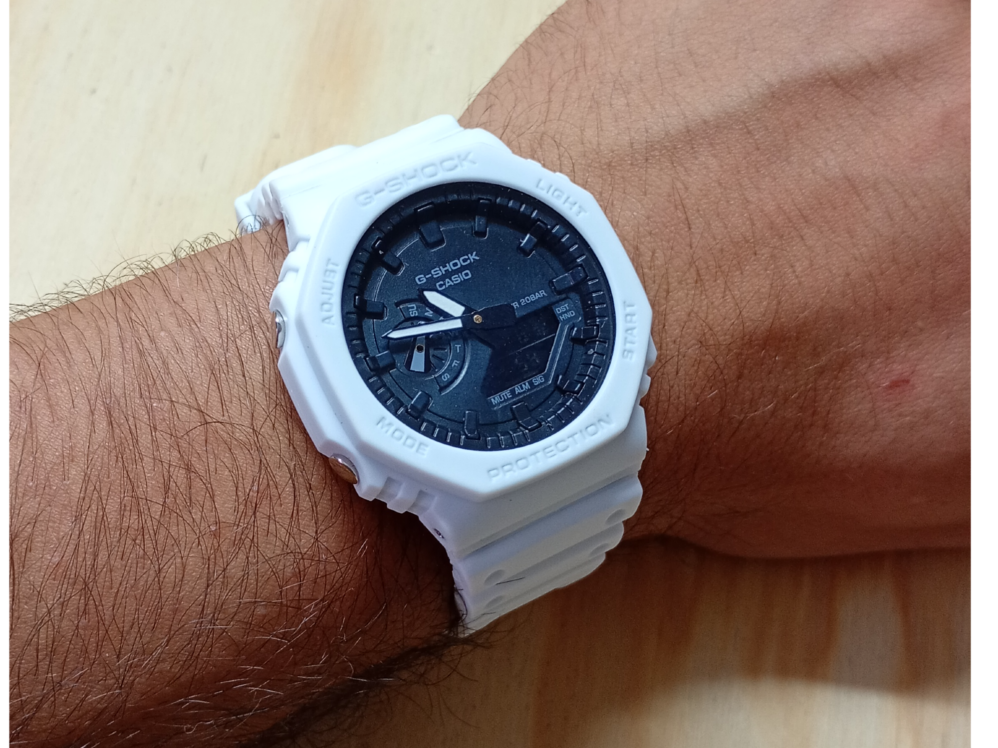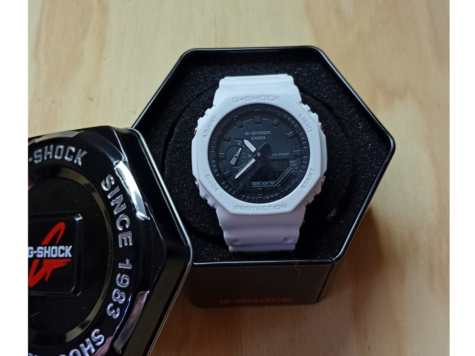 Ga 2100 White N Black Compartir por WhatsApp Copiar enlace Reloj de pulsera tipo Casio Gshock Ga 2100 de color blanco con dial negro, caja de plástico reforzado con tapa de acero atornillada, malla de silicona ajustable por hebilla metálica. Cuenta con luz, alarma, cronómetro y calendario completo. Es resistente a salpicaduras y golpes leves. Incluye lata$30.000 Observaciones 0 / 150