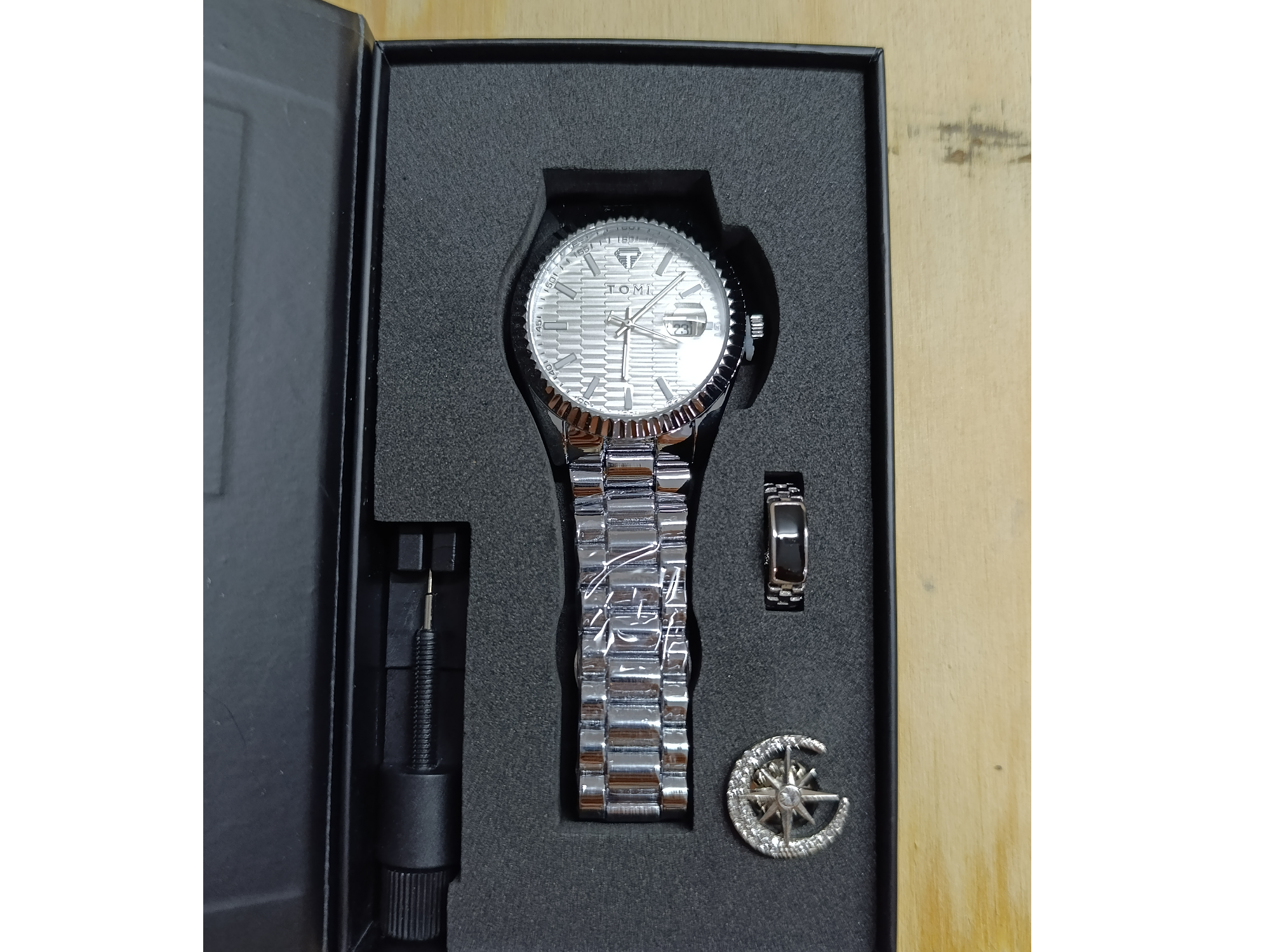 Kit premium Platinum Compartir por WhatsApp Copiar enlace Kit premium de reloj AAA all platinum, con anillo y pin complementarios. Además trae herramienta de achique. El reloj tiene hebilla doble desplegable, calendario funcional, inscripciones originales y movimiento quartz de precisión$45.000 Observaciones 0 / 150