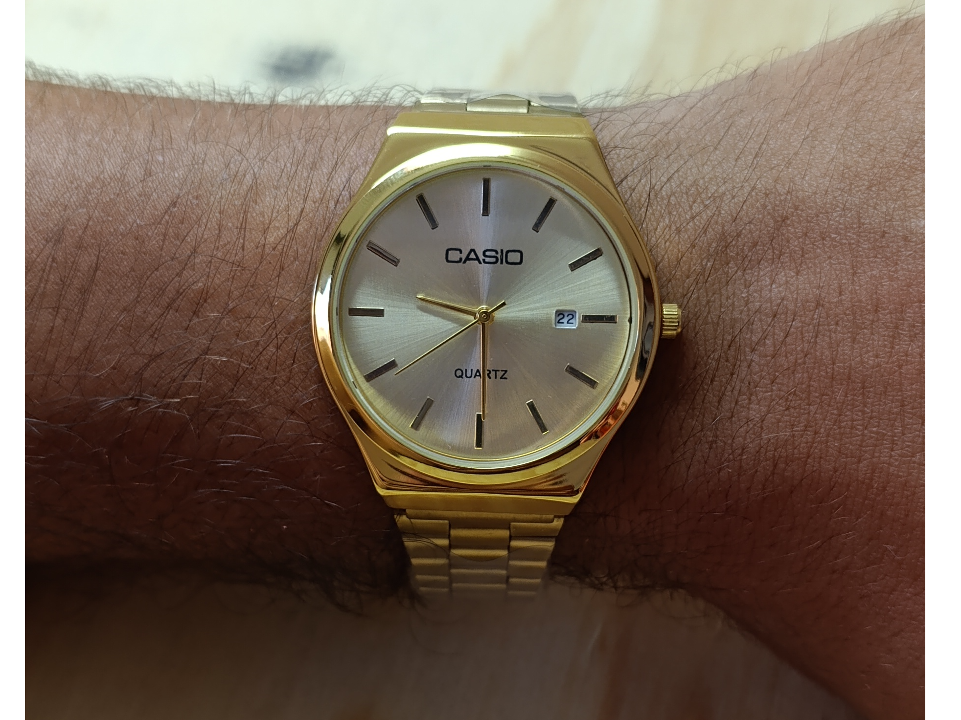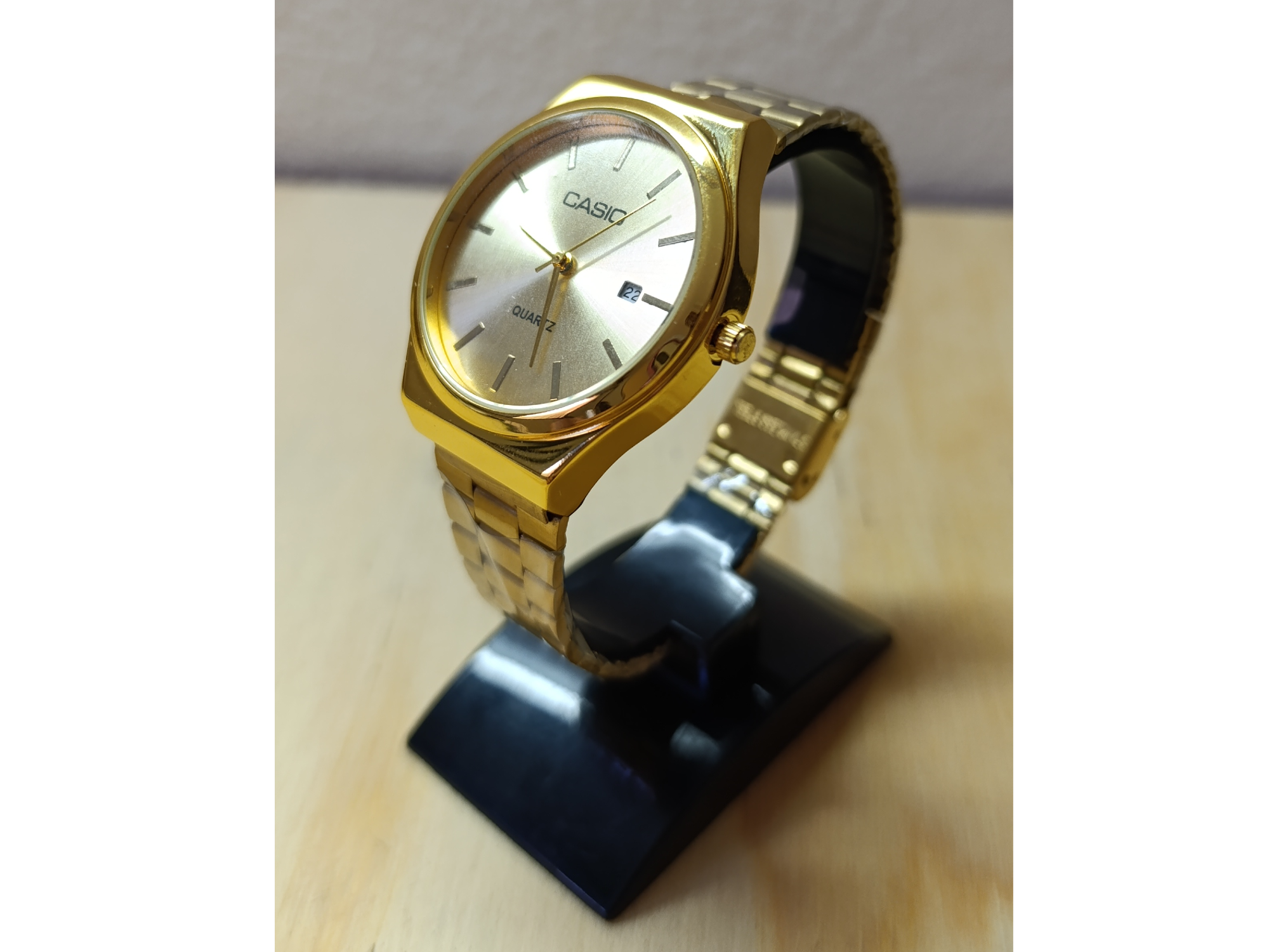 Redondo total Golden Compartir por WhatsApp Copiar enlace Reloj de pulsera tipo Casio de acero inoxidable, con malla regulable, calendario funcional, inscripciones originales y movimiento quartz de precisión. Malla y dial de color dorado$24.000 Observaciones 0 / 150