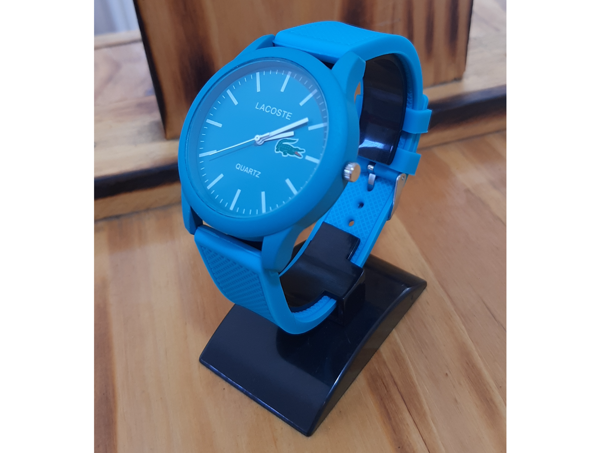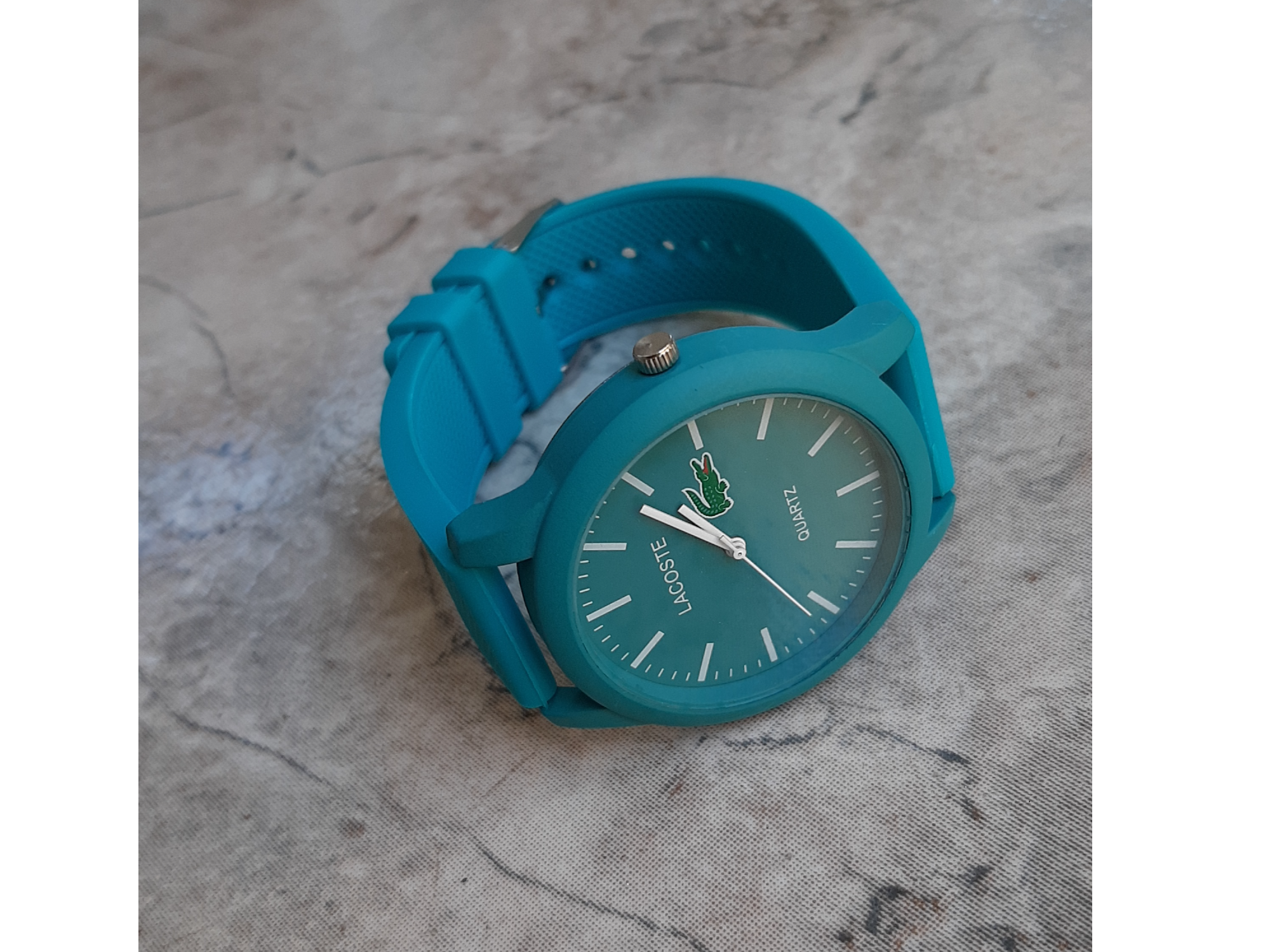Redondo "Tiffany" 1 Compartir por WhatsApp Copiar enlace Reloj de pulsera Lacoste alternativo color turquesa "Tiffany" con malla de silicona regulable por hebilla, con caja de acero inoxidable y movimiento quartz$20.000 Observaciones 0 / 150