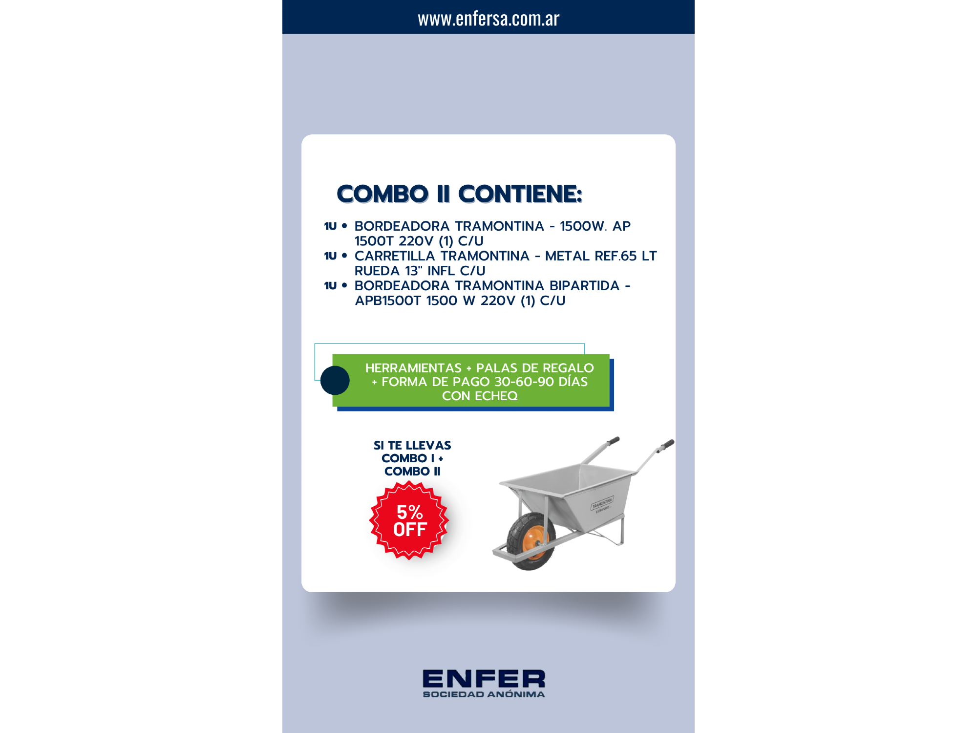 Combo PALAS DE REGALO Compartir por WhatsApp Copiar enlace Herramientas + palas de regalo + plazo de pago 30 - 60 - 90 días con echeq Si te llevas 2 combos: 5% OFF Presentaciones Seleccioná las opciones que quieras.COMBO TRAMONTINA I Precio neto (incluye 17% de bonificación) + IVA - Llevando COMBO I + COMBO II: 5%OFF $273.325COMBO TRAMONTINA II Precio neto (incluye 17% de bonificación) + IVA - Llevando COMBO I + COMBO II: 5%OFF $220.114 Observaciones 0 / 150 Encontrá productos relacionados 30 60 90 CON ECHEQ (3)