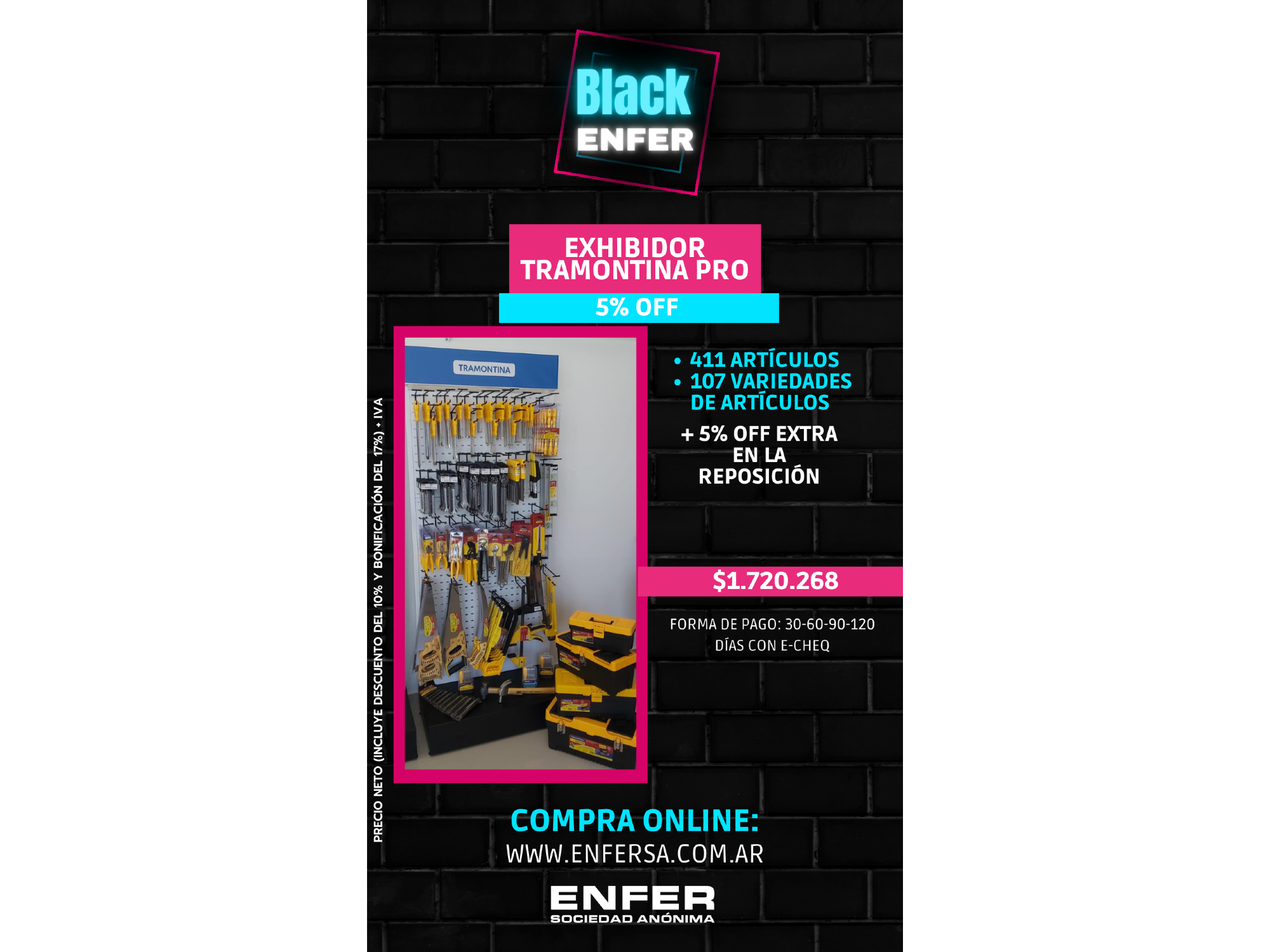 EXHIBIDORES TRAMONTINAOFERTA 5% OFF + 5% OFF EN LA REPOSICIÓN FORMA DE PAGO: 30 - 60 - 90 - 120 DÍAS CON ECHEQ PRECIO NETO (INCLUYE DESCUENTO DEL 5% + BONIFICACIÓN DEL 17%) + IVA Presentaciones Seleccioná las opciones que quieras.EXHIBIDOR TRAMONTINA PRO 215 ARTÍCULOS - 136 VARIEDADES DE ARTÍCULOS $1.162.313EXHIBIDOR TRAMONTINA MASTER 411 ARTÍCULOS - 107 VARIEDADES DE ARTÍCULOS $1.720.268 Observaciones 0 / 150 Encontrá productos relacionados 30 60 90 120 ECHEQ (1)