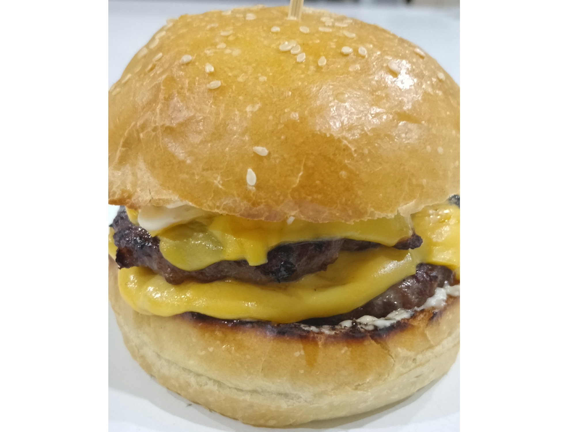 En pan casero, doble carne, doble cheddar y mayonesa.