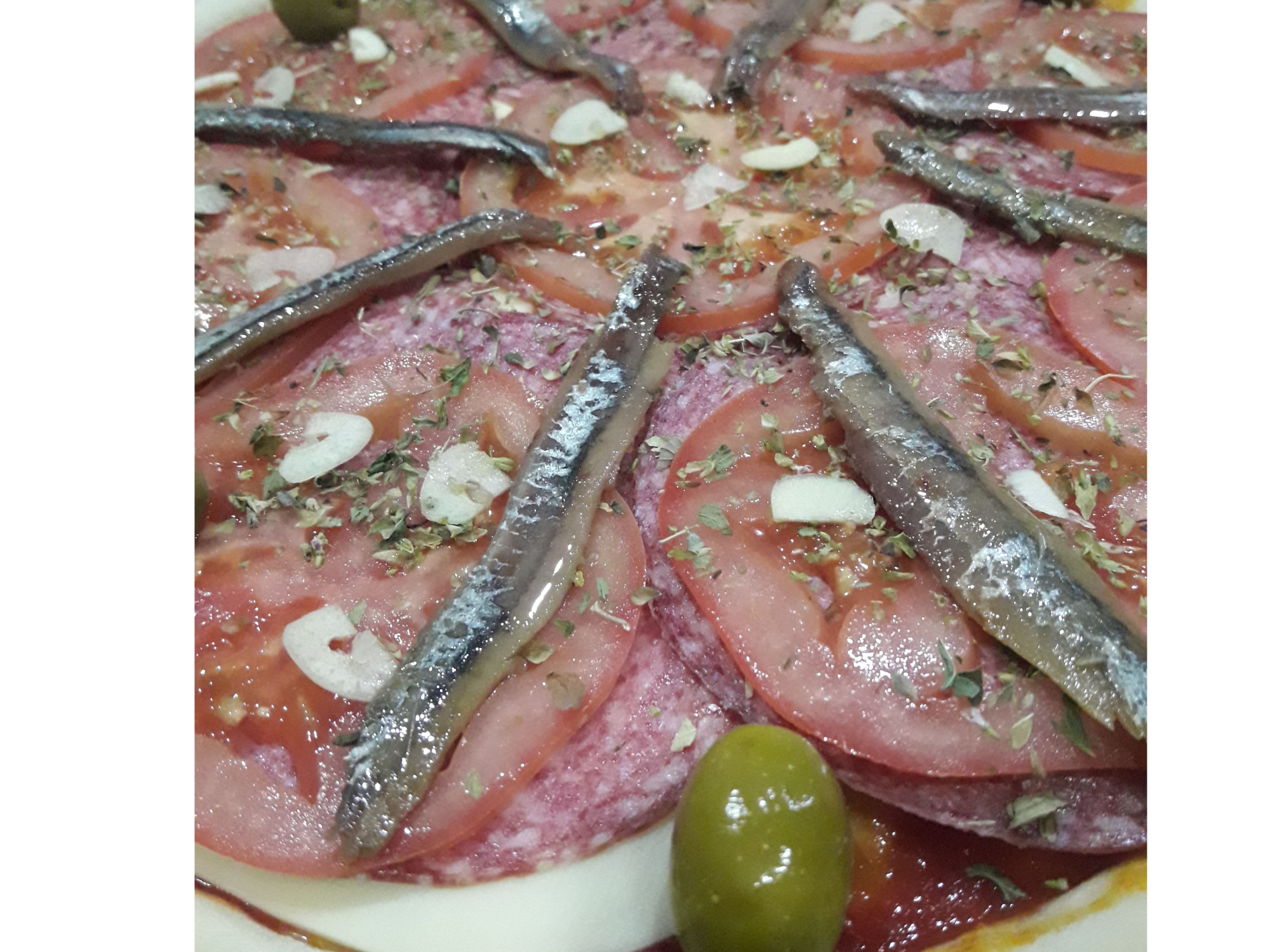 Napolitana con anchoasSalsa, mozzarella, salame Milán, tomates en rodajas, anchoas, ajo, orégano y aceitunas$16.000 Observaciones 0 / 150