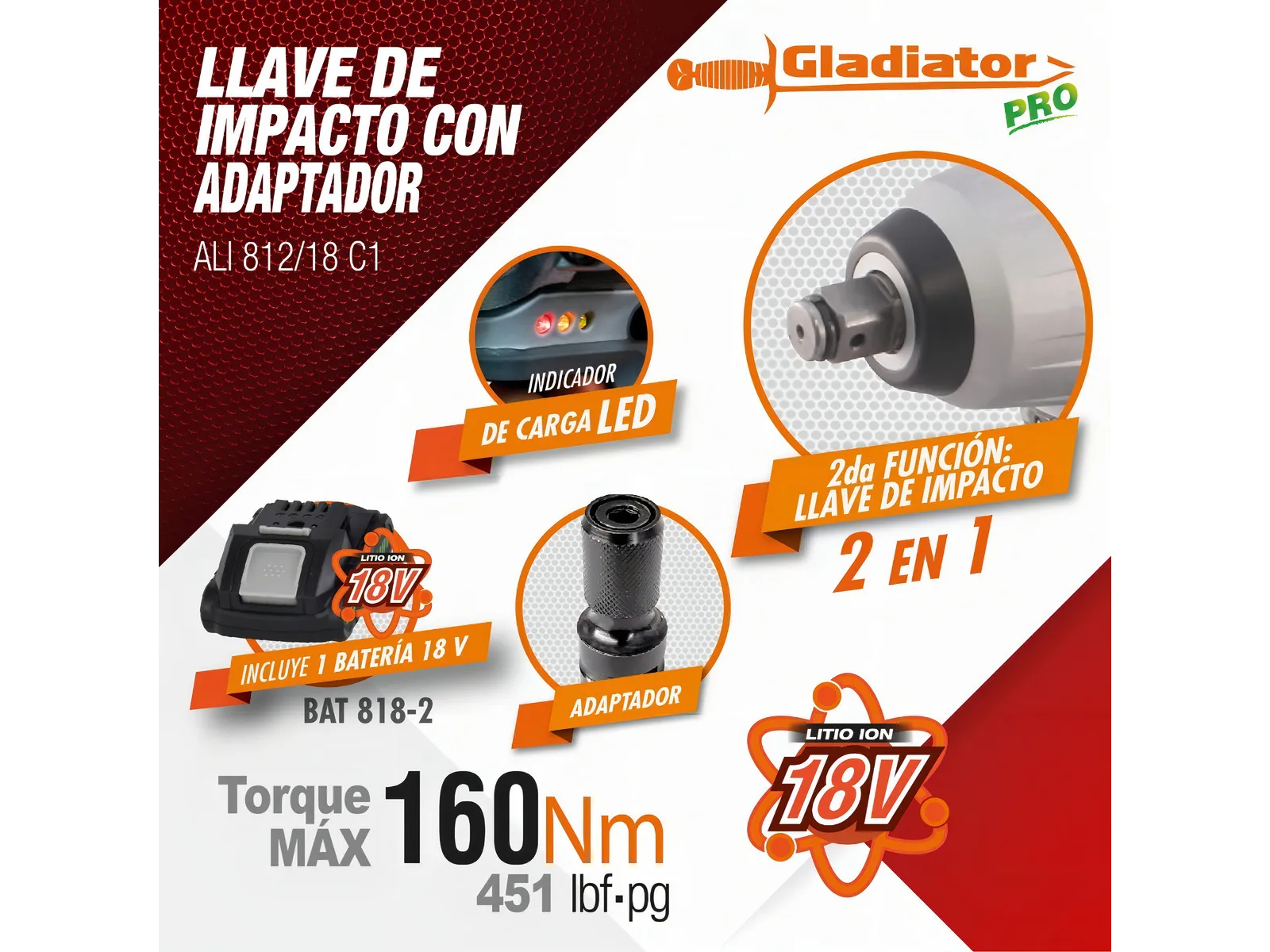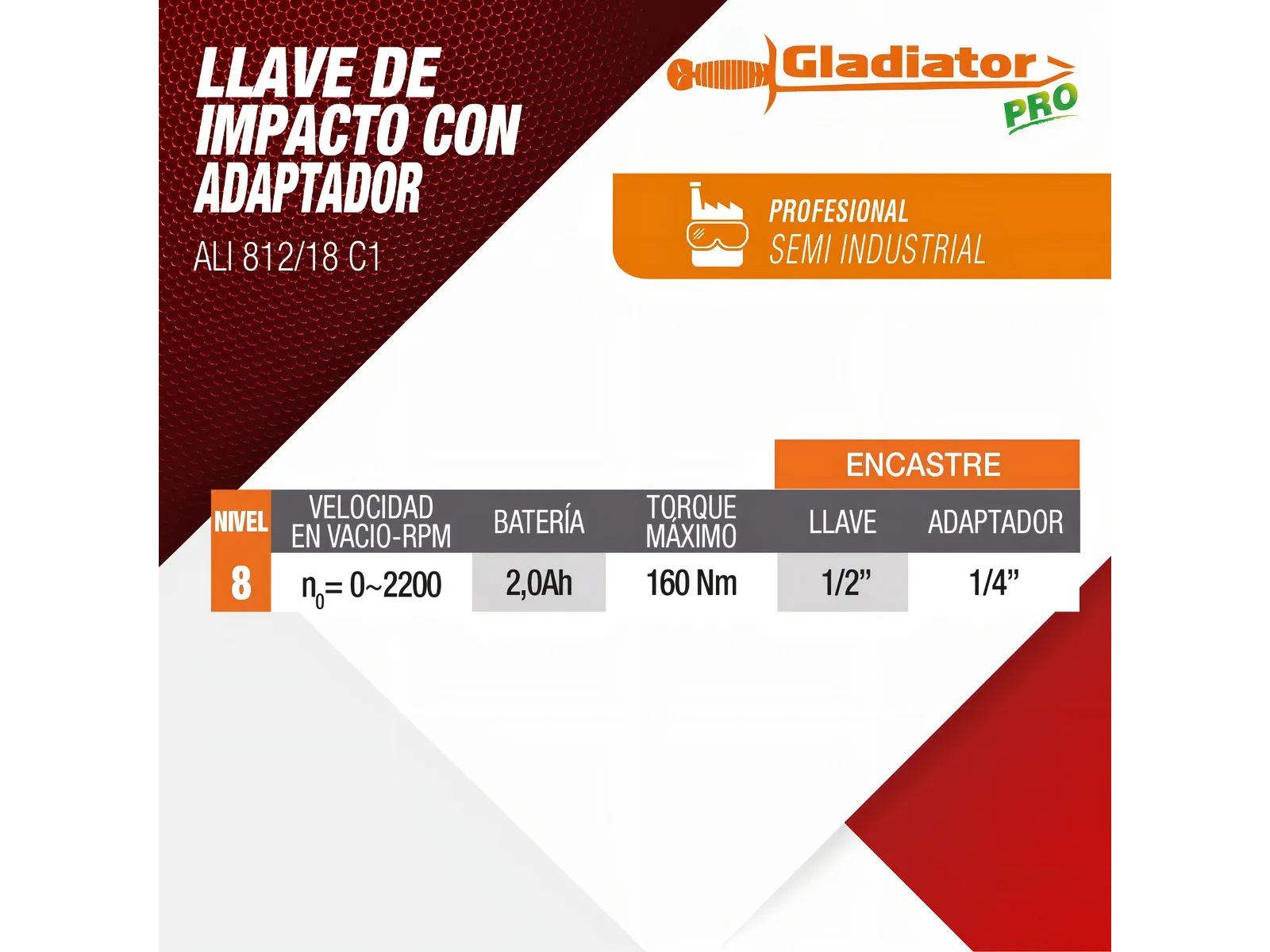ALI812/18C1Llave de impacto 18V - Gladiator Compartir Modelo: ALI812/18C1 Con adaptador para atornillador. Velocidad en vacío: 22000 rpm Torque: 160 N/m Encastre: 1/2" y 1/4" Batería: 18V - 2Ah Tensión máxima: 20V Corriente nominal: 4A Tensión nominal: 18V 1 batería 2Ah 1 cargador 3Ah$160.869 Observaciones 0 / 150