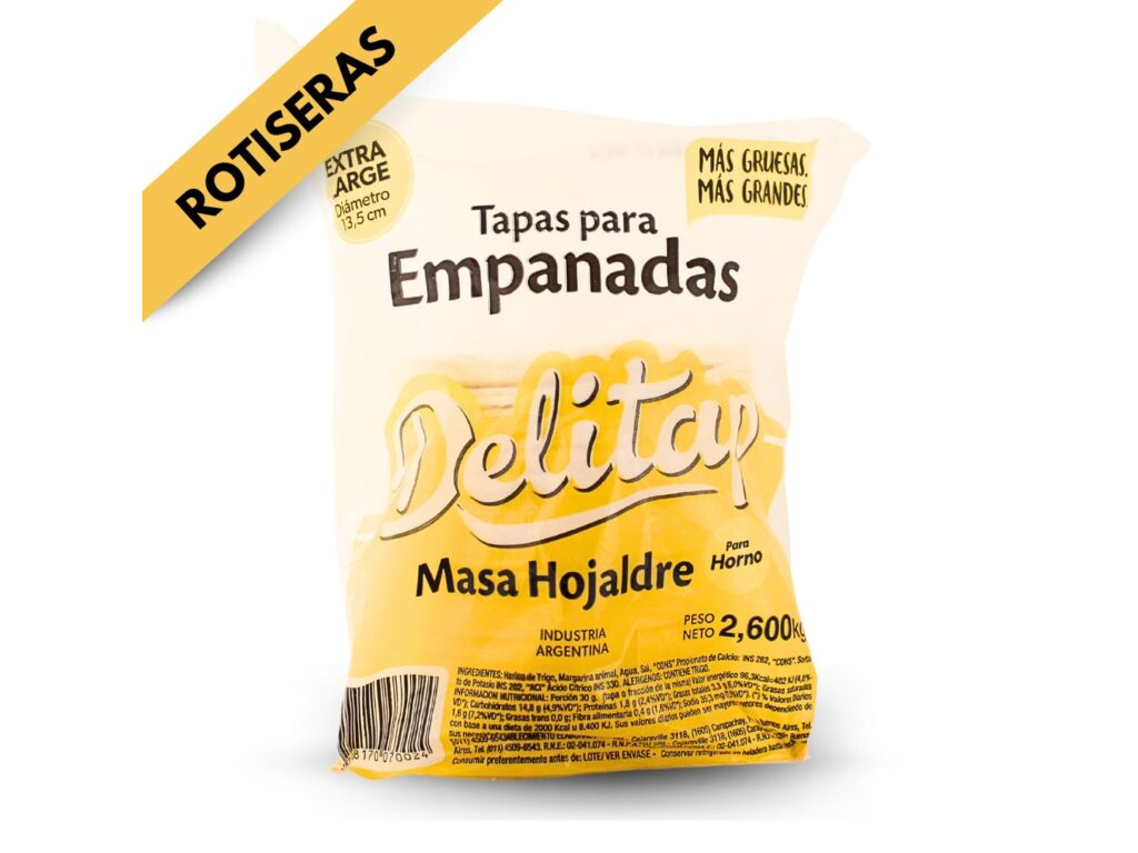 56556405TUBO T/EMPANDAS DELITAP x 60 unidades Compartir Discos de masa suave criolla y hojaldrada tipo casera. Ideales para elaborar empanadas al horno o fritas con el relleno que más te guste. . Cantidad por paquete: 5 docenas . Tamaño discos: 13.5 cm . Masa: criolla Presentaciones Seleccioná las opciones que quieras.7798170070253CRIOLLA$6.4007798170070024HOJALDRE$6.400 Observaciones 0 / 150