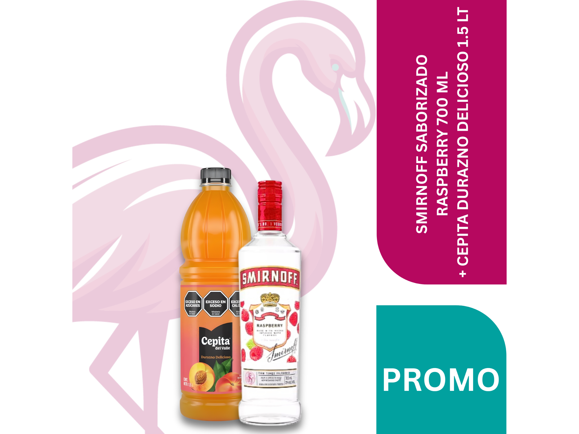 SMIRNOFF S/ RASPBERRY 700 ML + CEPITA DURAZNO DELICIOSO 1.5 LT Compartir por WhatsApp Copiar enlace PROMO: SMIRNOFF SABORIZADO RASPBERRY 700 ML + CEPITA DURAZNO DELICIOSO 1.5 LT 💎$15.000$13.000 13% OFF Personalizá tu selección Las siguientes opciones aplican para cada producto agregado. EXTRAS / DESCARTABLES Seleccioná las opciones que quieras.VASO 800 ML$250$200 20% OFF SORBETES$25$20 20% OFF BOLSA HIELO 1,5 KG$3.500$2.500 29% OFF BOLSA HIELO 2 KG$4.000$3.000 25% OFF Observaciones 0 / 150 Encontrá productos relacionados PROMO SMIRNOFF (40)