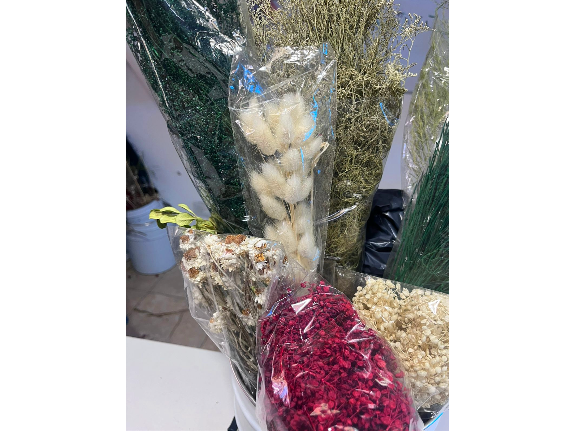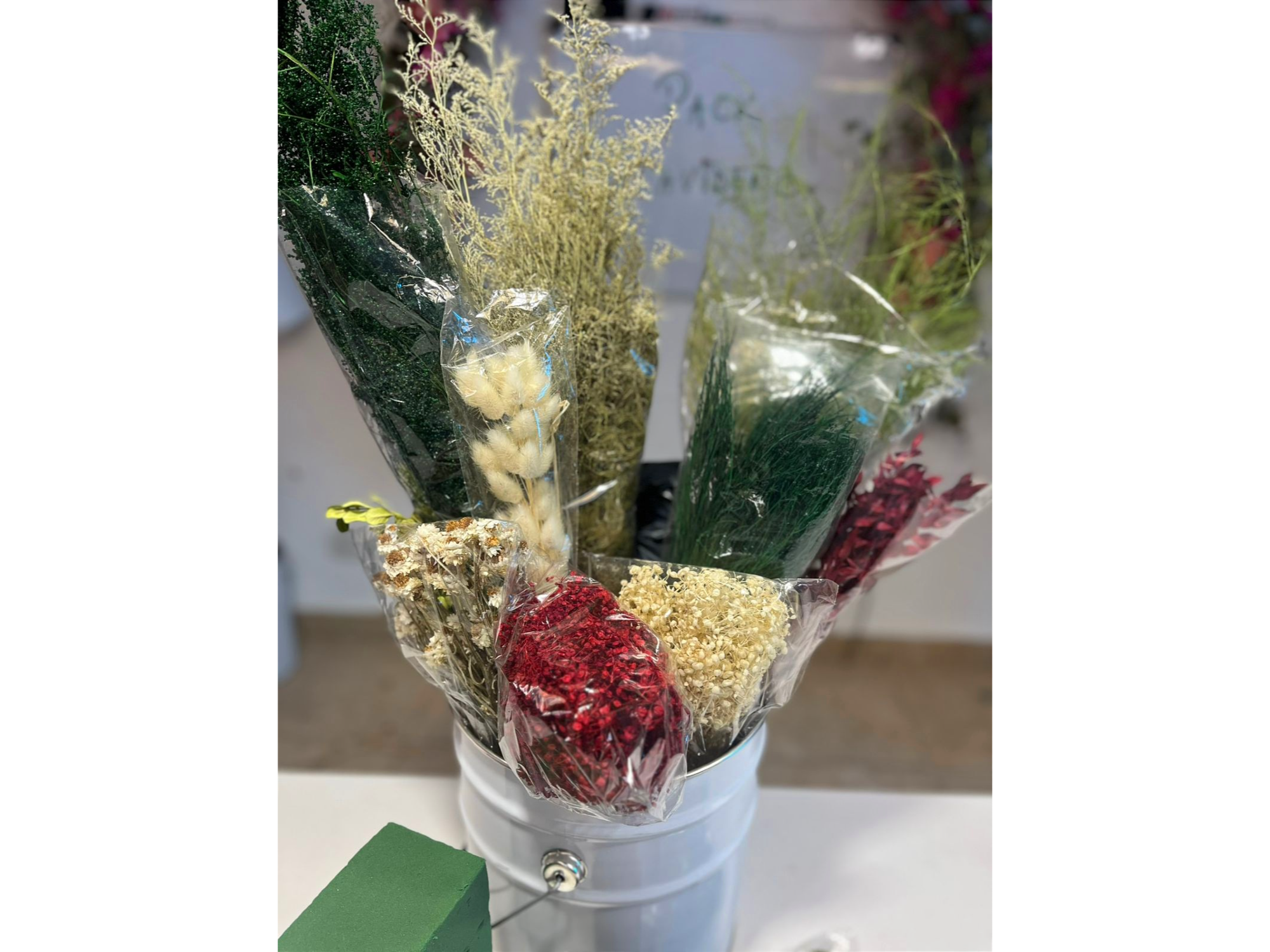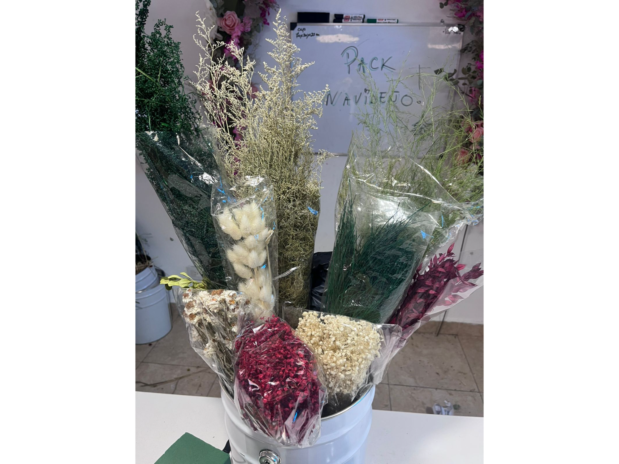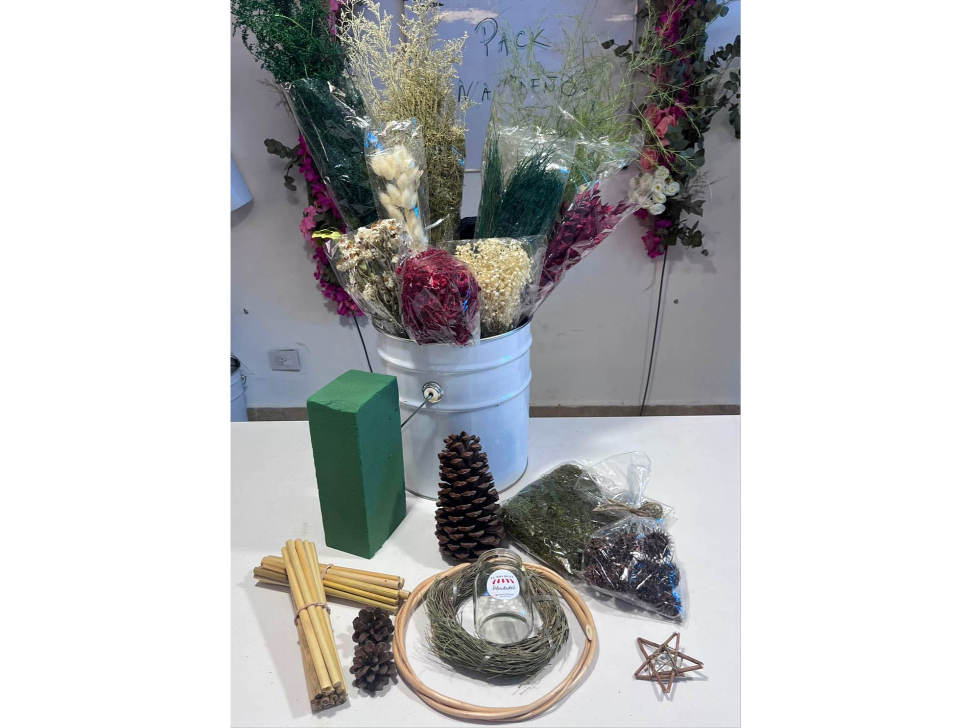 Este PACK contiene 21 productos en total, de los cuales 10 son flores variadas en tonos navideños (rojo/verde/crudo/blanco) y los otros 11 productos son insumos para que con ambos puedas armar diferentes combinaciones para esta época de fiestas. Ideal para hacer centros de mesa, ramos, deco pared, guirnaldas y lo que se te ocurra.