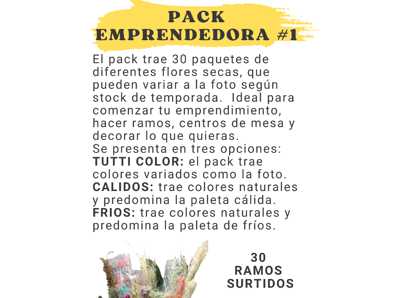 PACK EMPRENDEDORA # 1El PACK que trae 30 paquetes de diferentes flores secas, que pueden variar a la foto de acuerdo a stock de temporada. Ideal para empezar cualquier emprendimiento: ramos para revender, centros de mesa, adornos florales, todo tipo de manualidades. Tenes tres opciones diferentes, Tutti color, Cálidos y Fríos Presentaciones Seleccioná una opción.Pack emprendedora TUTTI COLOR Traen variedad de flores y variedad de colores, mezclados con los naturales y crudos. $119.000Pack emprendedora CALIDOS Traen variedad de flores y la paleta de colores calidos (rojo/amarillo/naranjas/rosas/salmon/bordo/fuxsia) combinados con naturales y crudos. $120.000Pack emprendedora FRIOS Traen variedad de flores y la paleta de colores frios (celeste, verde , azules, violetas) combinados con naturales y crudos. $120.000 Observaciones 0 / 150