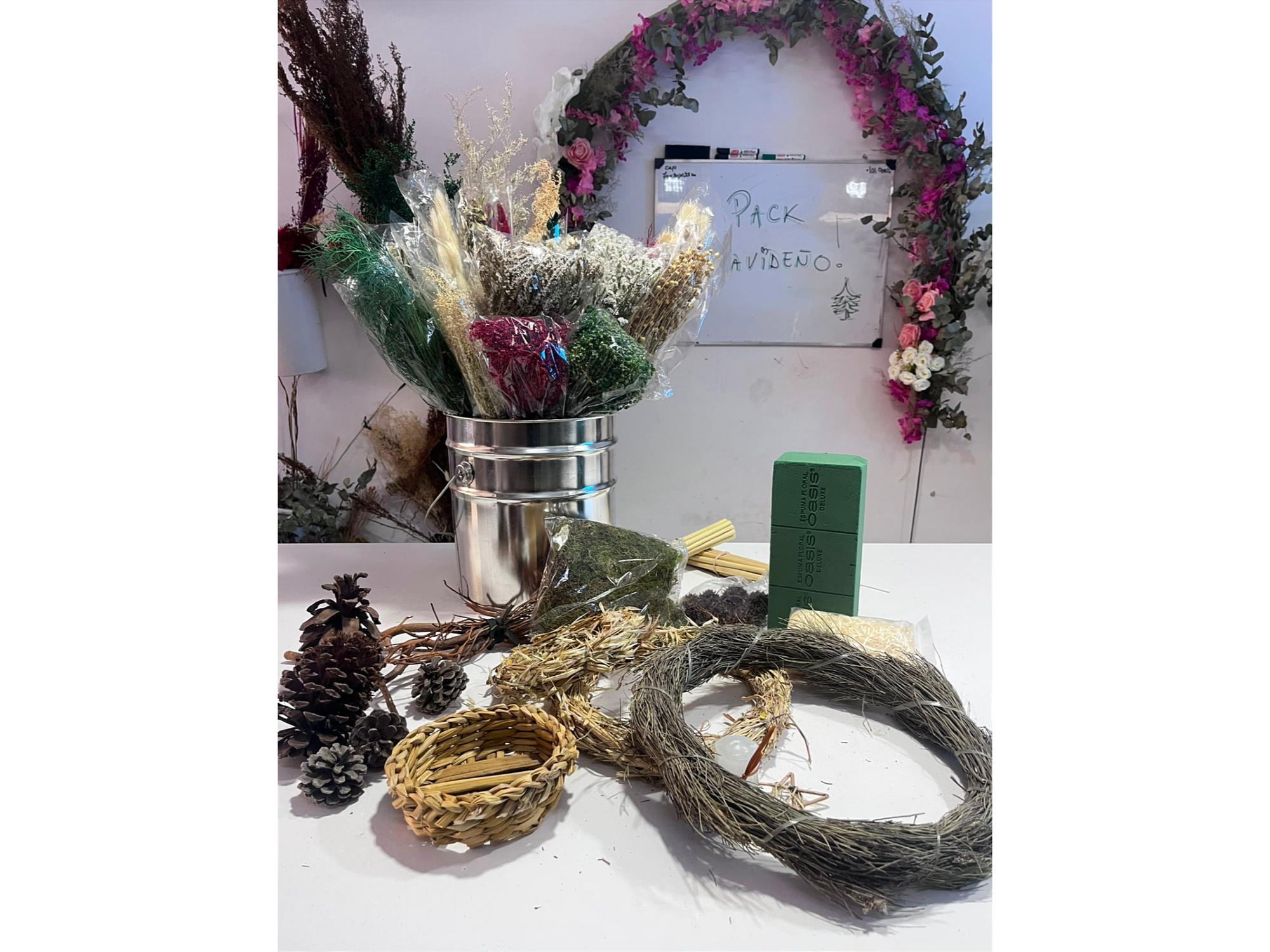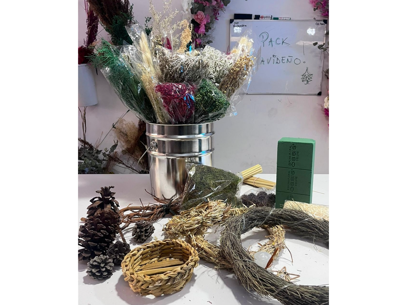 Este PACK contiene 36 productos en total, de los cuales 21 son ramos de flores variadas en tonos navideños (rojo/verde/crudo/blanco) y los otros 15 productos son insumos para que con ambos puedas armar diferentes combinaciones para esta época de fiestas. Ideal para hacer centros de mesa, ramos, deco pared, guirnaldas y lo que se te ocurra. Incluyen vela y cesto de mimbre para hacer centros de mesa