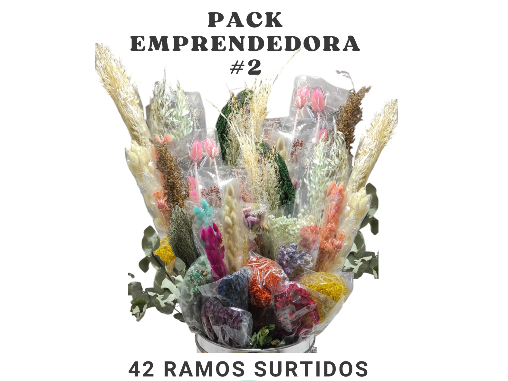 PACK EMPRENDEDORA # 2El PACK que trae 42 paquetes de diferentes flores secas, algunas premium, que pueden variar a la foto de acuerdo a stock de temporada. Ideal para empezar cualquier emprendimiento: ramos para revender, centros de mesa, adornos florales, todo tipo de manualidades. Tenes tres opciones diferentes, Tutti color, Cálidos y Fríos Presentaciones Seleccioná una opción.Pack emprendedora #2 TUTTI COLOR Traen variedad de flores y variedad de colores, mezclados con los naturales y crudos. $189.000Pack emprendedora # 2 CALIDOS Traen variedad de flores y la paleta de colores calidos (rojo/amarillo/naranjas/rosas/salmon/bordo/fuxsia) combinados con naturales y crudos. $189.000Pack emprendedora # 2 FRIOS Traen variedad de flores y la paleta de colores frios (celeste, verde , azules, violetas) combinados con naturales y crudos. $189.000 Observaciones 0 / 150