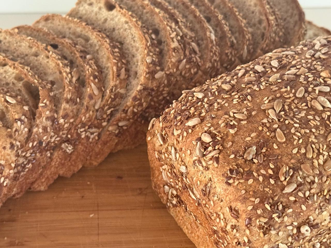 Elaborado con harina integral organica , harina de centeno integral organica, semillas de girasol, chia, lino y sesamo orgánicas, fermento masa madre.