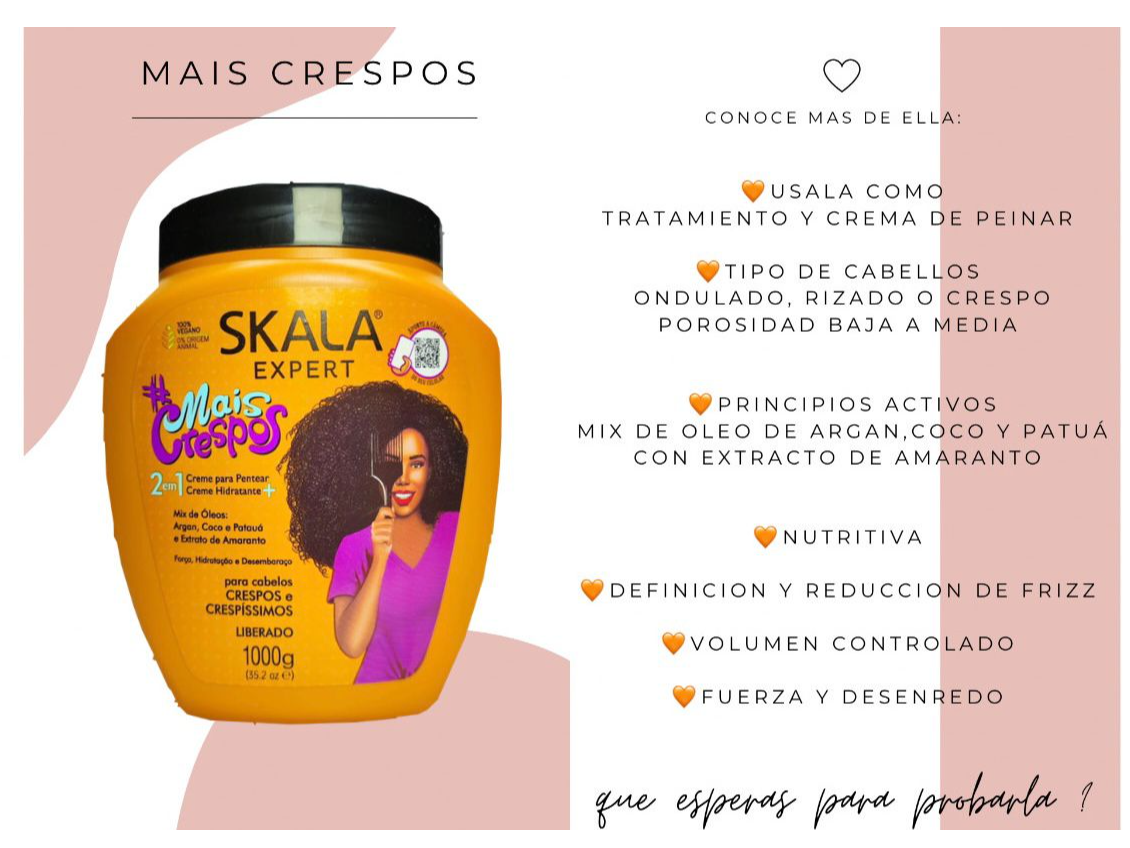 la línea Skala Expert Mais Crespos está formulada específicamente para este tipo de pelo, proporcionando hidratación, nutrición y fortalecimiento. También puedes usar la línea Skala Expert #MaisCachos, que también es adecuada para cabellos rizados y afros.