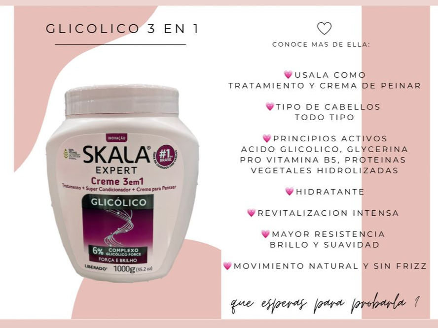 Skala Glicólico (3 en 1). Es un producto vegano que se puede usar como mascarilla de hidratación, acondicionador o crema para peinar y está diseñado para fortalecer y revitalizar el cabello, en especial si está seco, dañado y sin brillo.