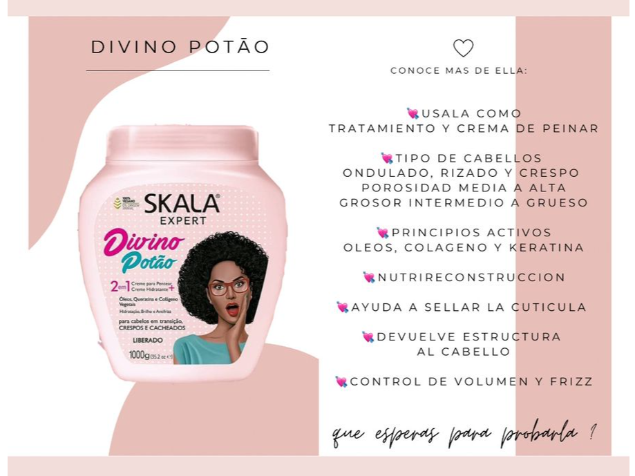 El producto Skala Divino Potão es una crema de tratamiento 2 en 1 (tratamiento y crema de peinar) ideal para personas con cabello rizado, afro y en transición capilar. Su fórmula es 100% vegana y no contiene sulfatos, parabenos, siliconas, petrolato ni aceite mineral.