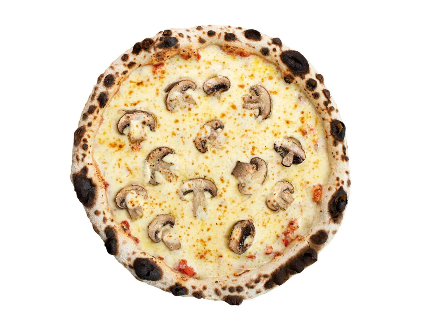Salsa de tomates, mozzarella, hongos portobello y queso ahumado.