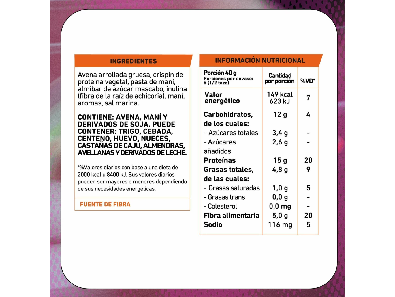 Granola Proteica Pasta de Maní Compartir 15g DE PROTEINA POR PORCIÓN 5g DE FIBRA SIN CONSERVANTES PLANT BASED$10.500 Observaciones 0 / 150