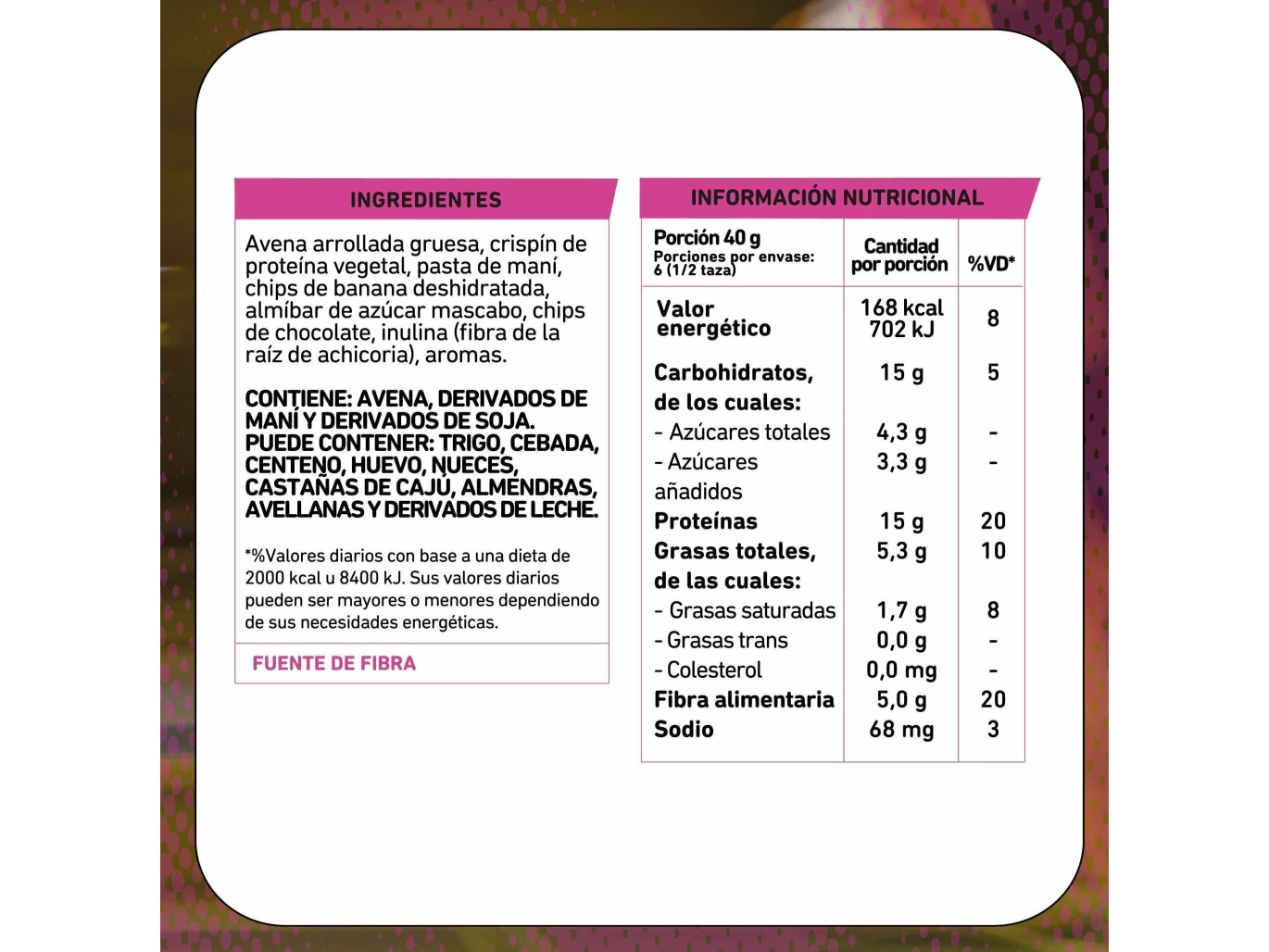 Granola Proteica Banana & Chocolate Compartir 15g DE PROTEINA POR PORCIÓN 5g DE FIBRA SIN CONSERVANTES PLANT BASED$10.500 Observaciones 0 / 150