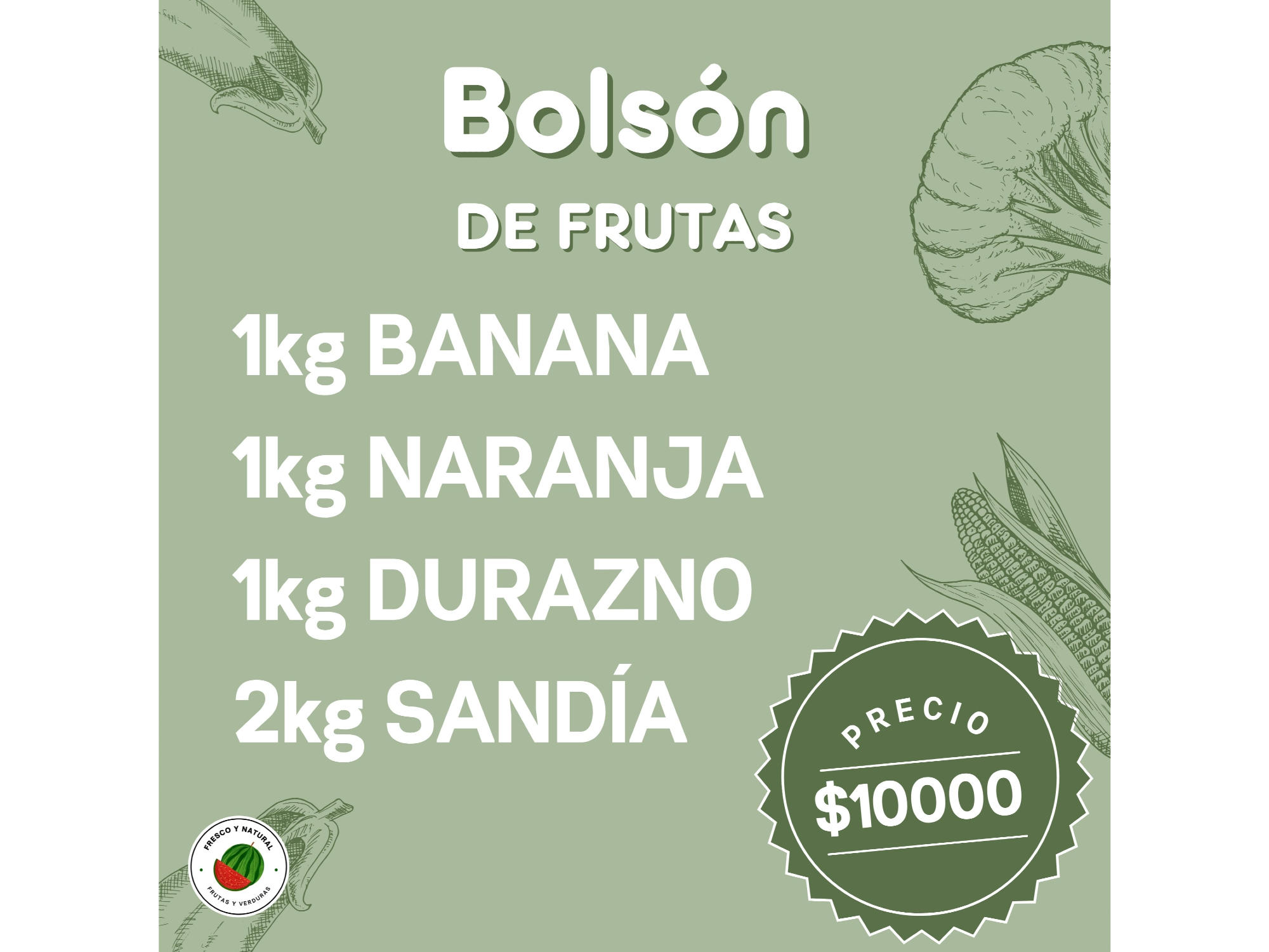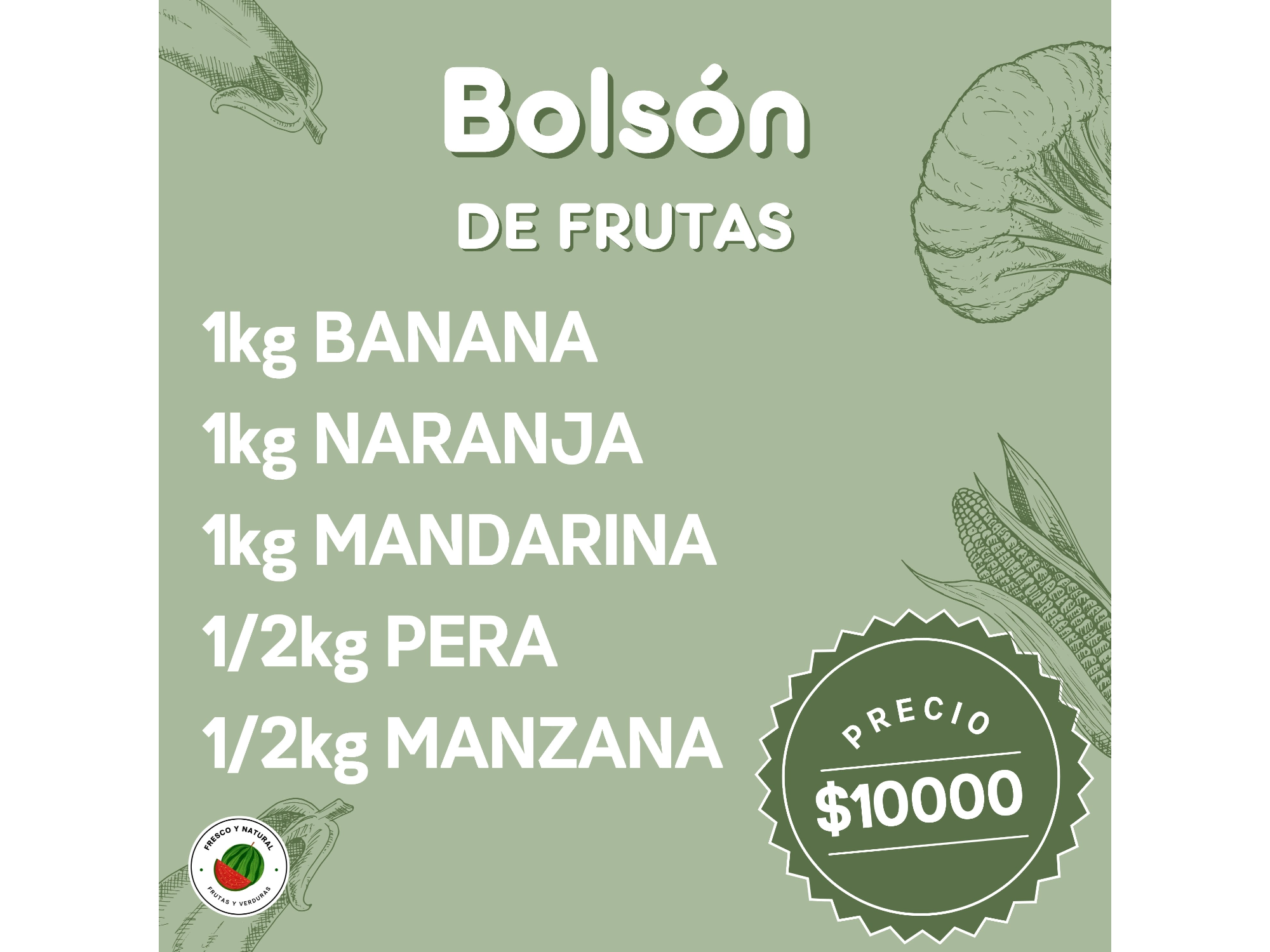 BOLSONES Compartir por WhatsApp Copiar enlace Bolson frutas $10.000 Bolson verduras $10.000 Bolson mixto $10.000 Bolson XXL $15.000