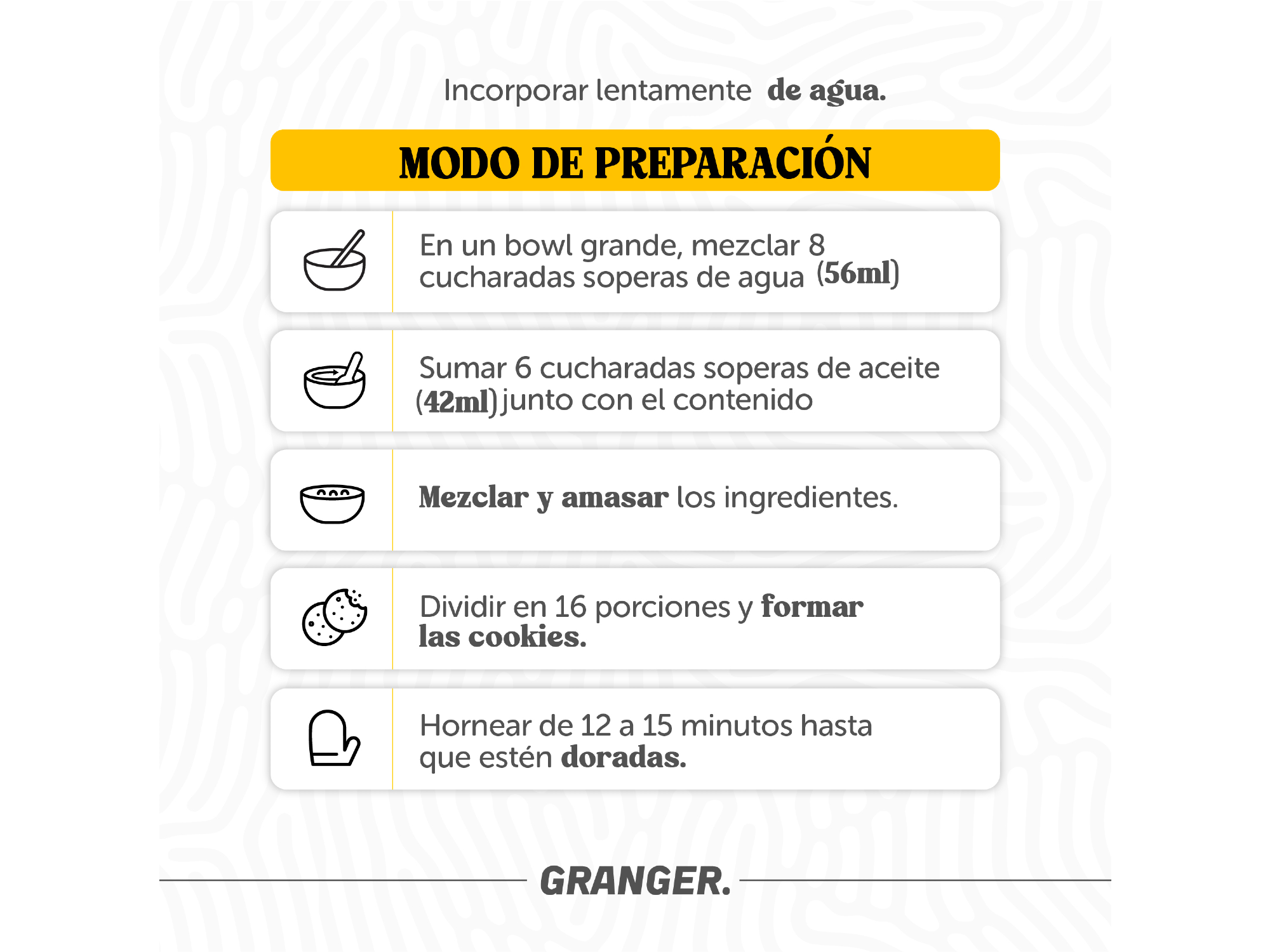 Mezclar: En un bowl grande, colocar 8 cucharadas soperas de agua.