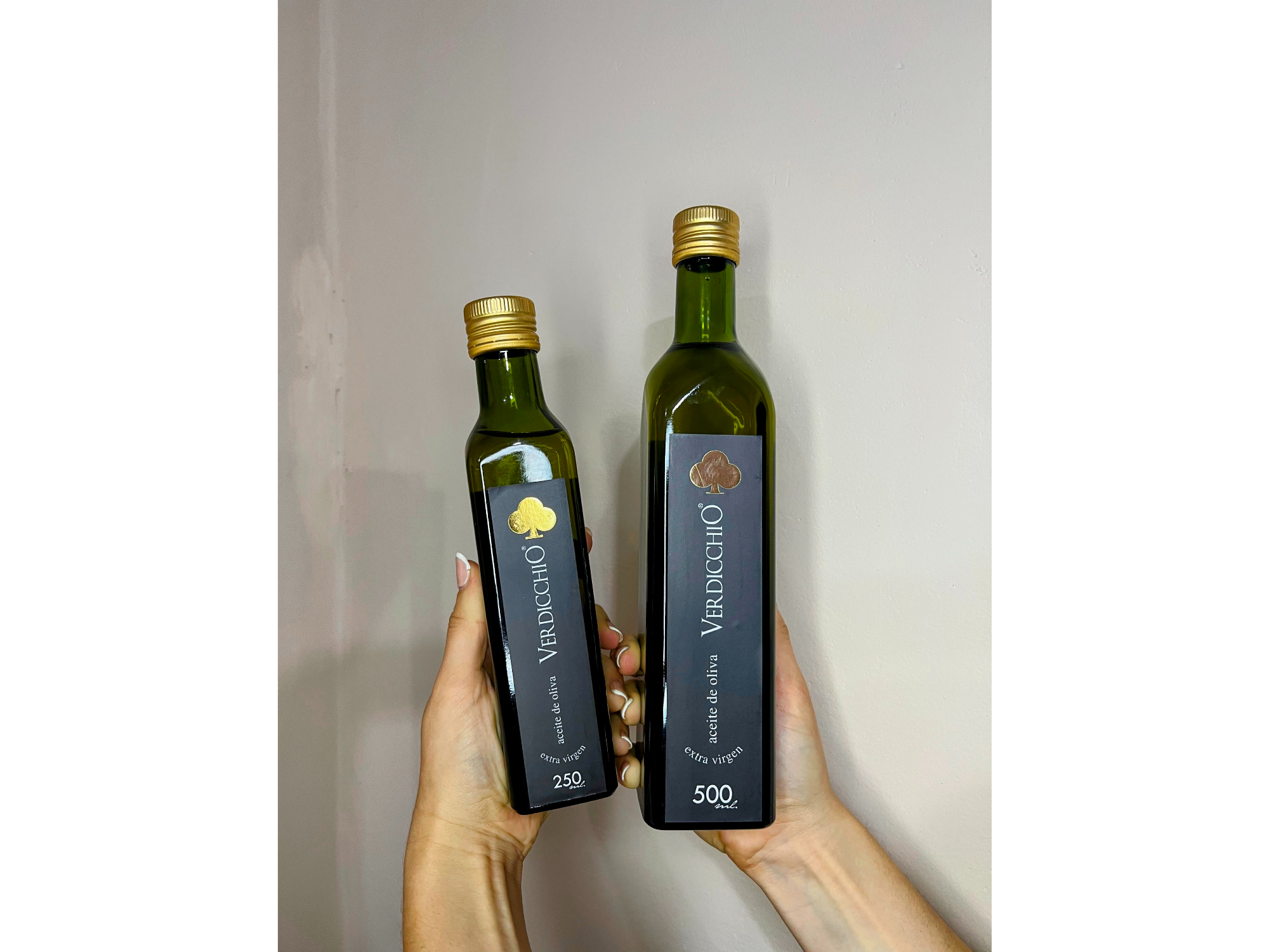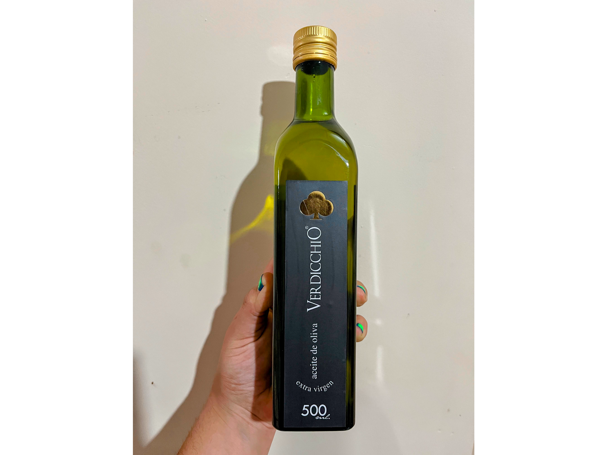 Aceite de oliva extra virgen Verdicchio, ideal para quienes desean probar nuevos sabores. Es un blend compuesto por dos variedades de aceite, Arbequina y Coratina, para lograr una combinación equilibrada entre frescura y notas de picor y amargor.