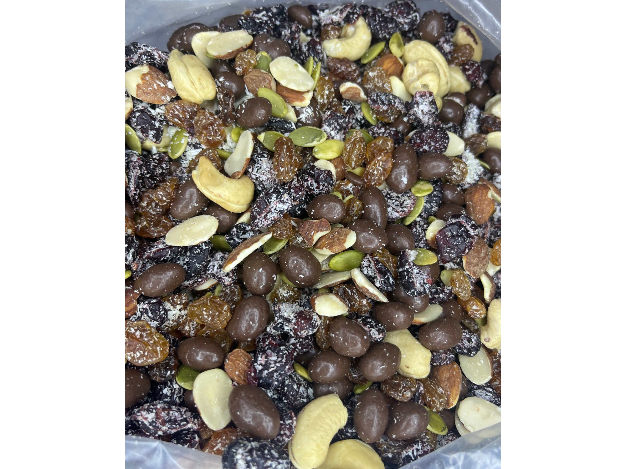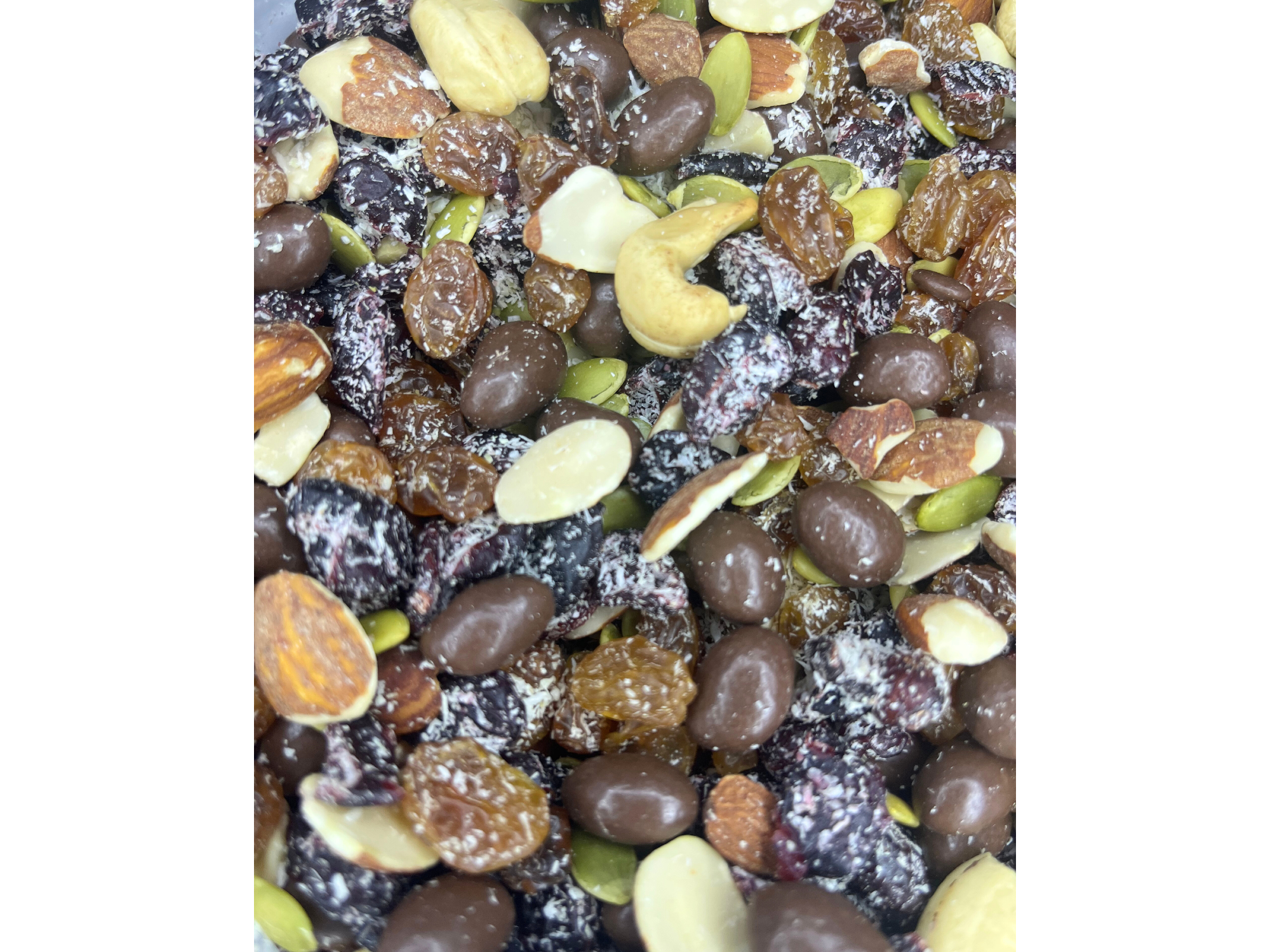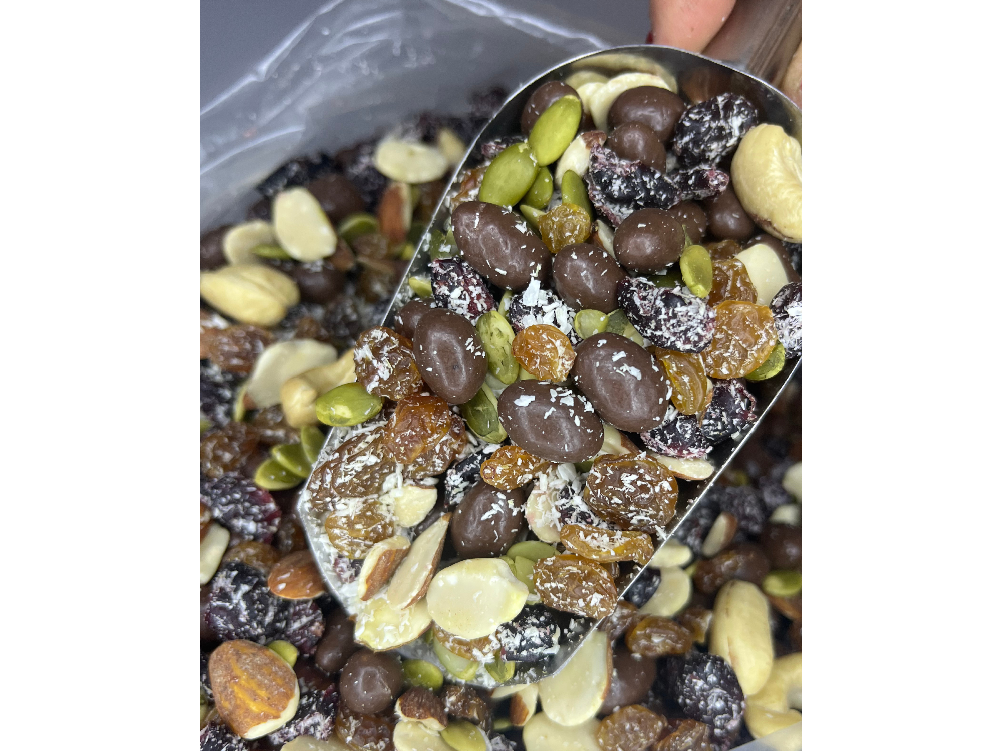 Combinación perfecta de maní con chocolate, arándanos deshidratados, semillas de zapallo, almendras, castañas, coco rallado y pasas rubias.
