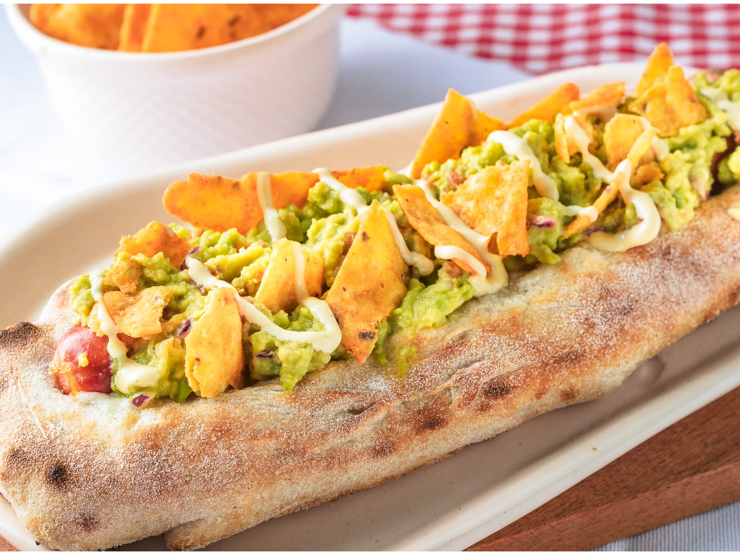 Masa Fermentada 48 h s, Mozzarella, Salchicha Estilo Alemana Ahumada, Guacamole, Mayonesa Ahumada, Nachos.