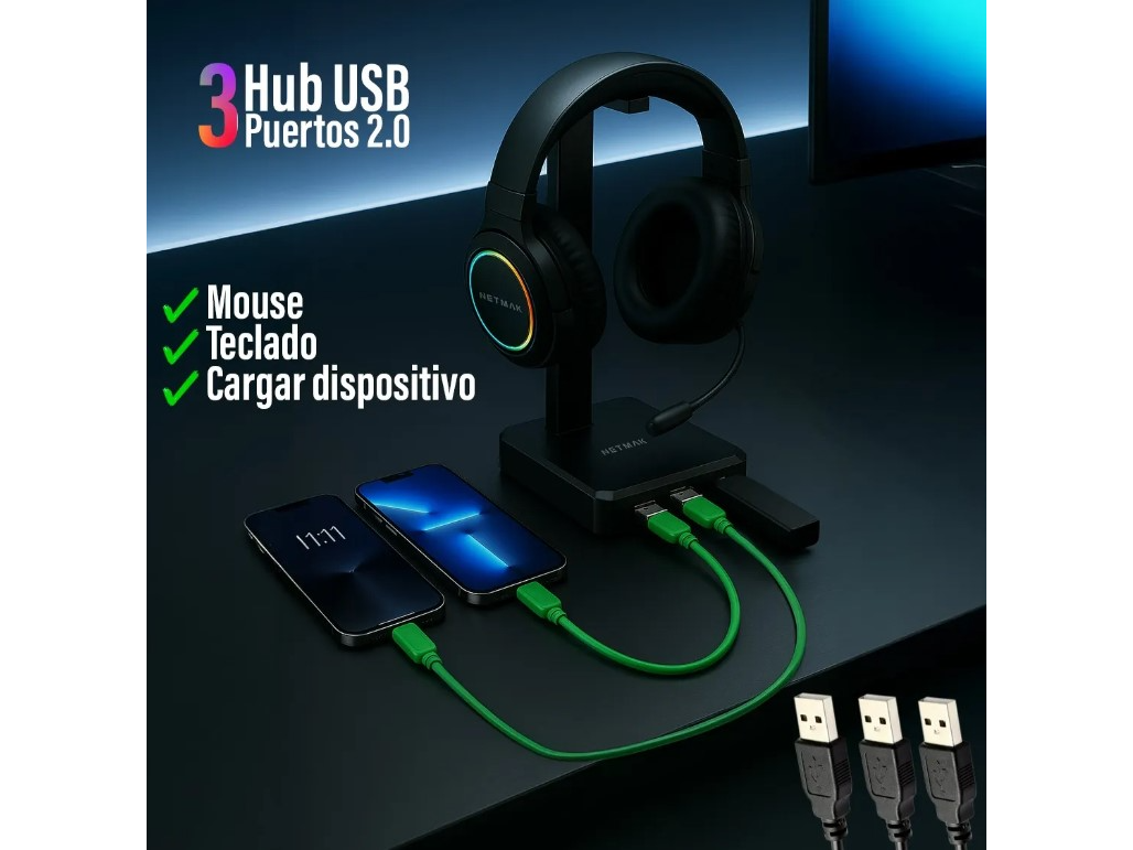 Base Para Auriculares Compartir Cable USB desmontable Hub USB: 3 puertos USB 2.0 Compatible con todos los auriculares. Antideslizante: máxima estabilidad Tamaño: 28 x 12 x 10,5 cm 3 PUERTOS USB ILUMINACIÓN RGB$25.000 Observaciones 0 / 150