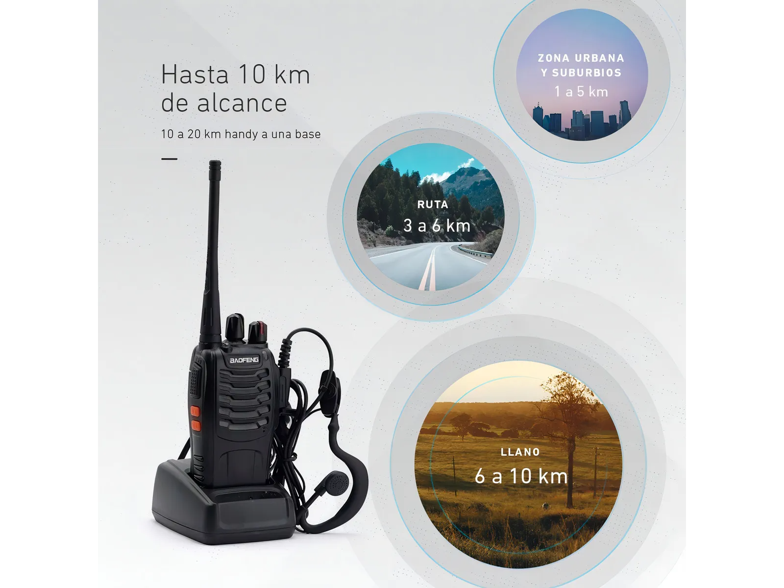 • Alcance: 3 a 5 km en ciudad - 5 a 10km en campo abierto - Handy a una base 10km en ciudad - Handy a una base 20km en campo abierto.