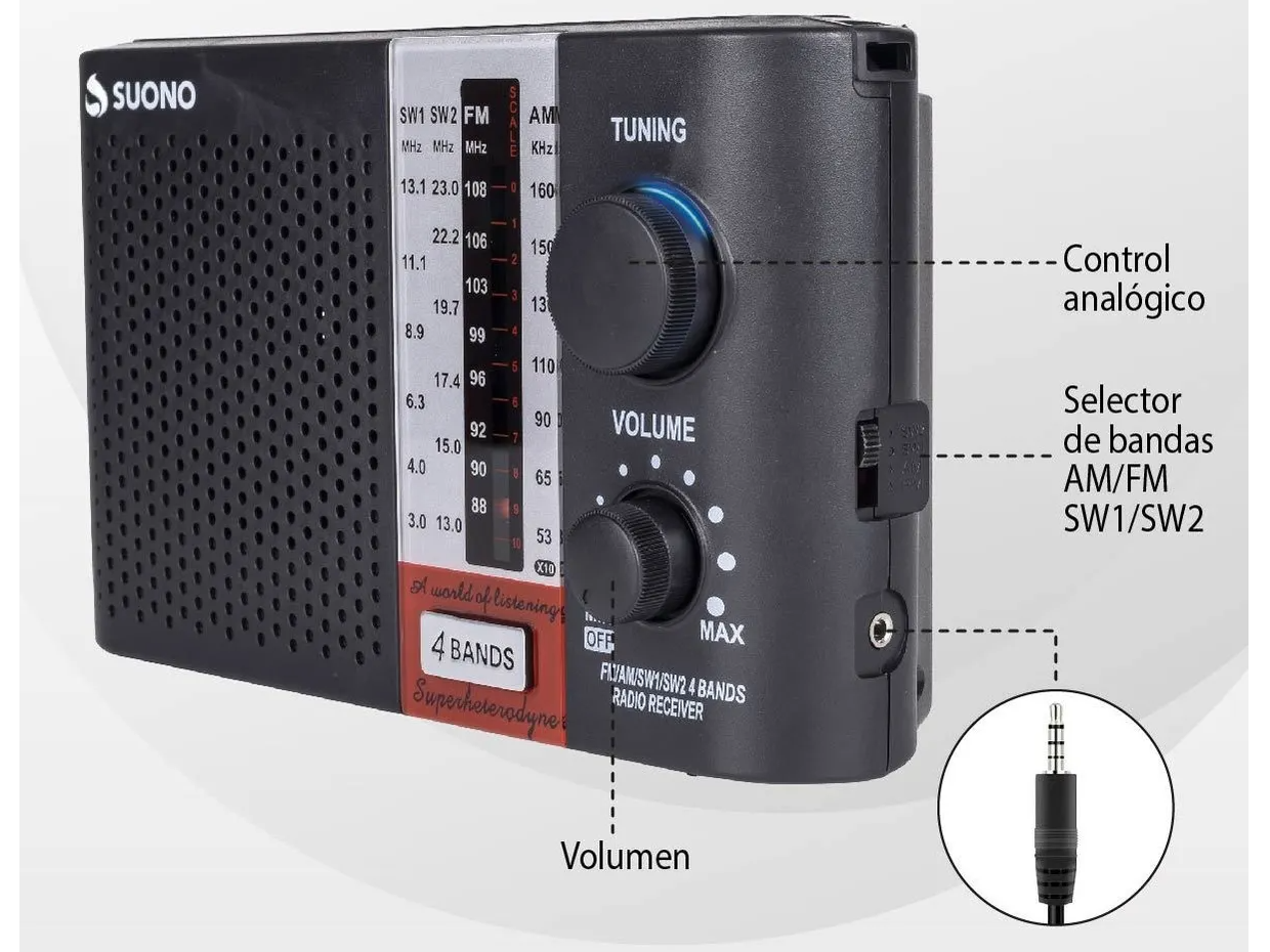 Disfruta de tus emisoras de radio favoritas en cualquier lugar con la Radio Portátil Suono AYV01234. Este elegante dispositivo en color negro es perfecto para llevar contigo a todas partes, gracias a su diseño compacto y portátil. Sintoniza tus estaciones de AM, FM, SW1 y SW2 con facilidad gracias a su radio analógico y escucha la música o programas que más te gusten.