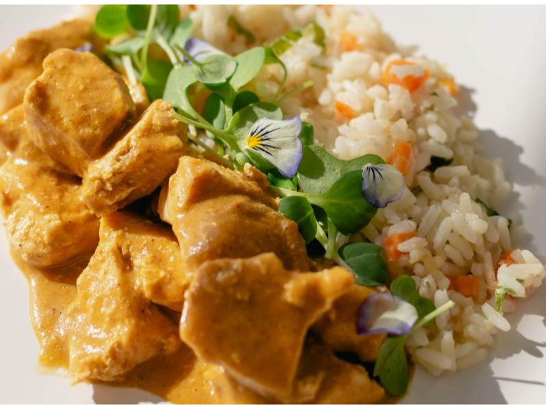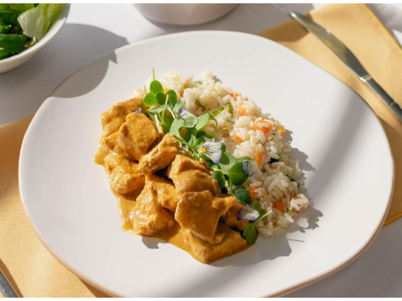 Jugosos trozos de pollo en salsa curry con todo el sabor de la cocina india, acompañados de arroz salteado con vegetales frescos.
