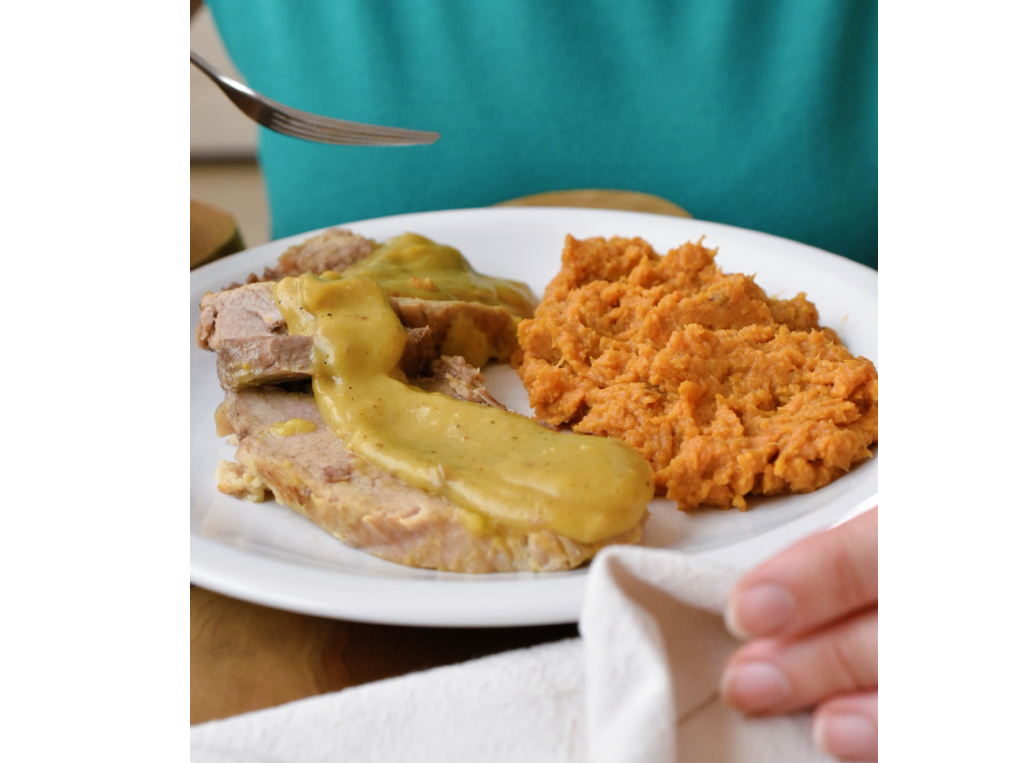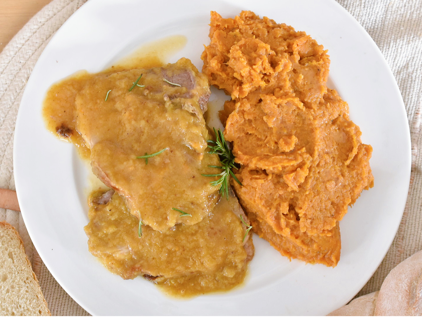 Bondiola de cerdo braseada con una deliciosa salsa de mostaza, acompañada con un suave y cremoso puré de batata que equilibra los sabores intensos del plato.