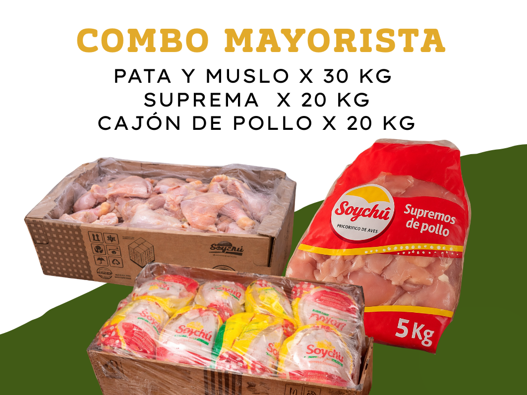 COMBOS MAYORISTAS Compartir por WhatsApp Copiar enlace Pata y Muslo x 30 kg + Cajón de pollo 20kg + Supremas 20 kg $296.626 Pata y Muslo x 30 kg ( el kg $ 3.085 ) + Supremas x 20 kg $225.436 Pata y Muslo x 30 kg + Suprema CONGELADA x 20 kg $225.436 Pata y Muslo x 30 kg + Supremas IQF 30 kg $225.436
