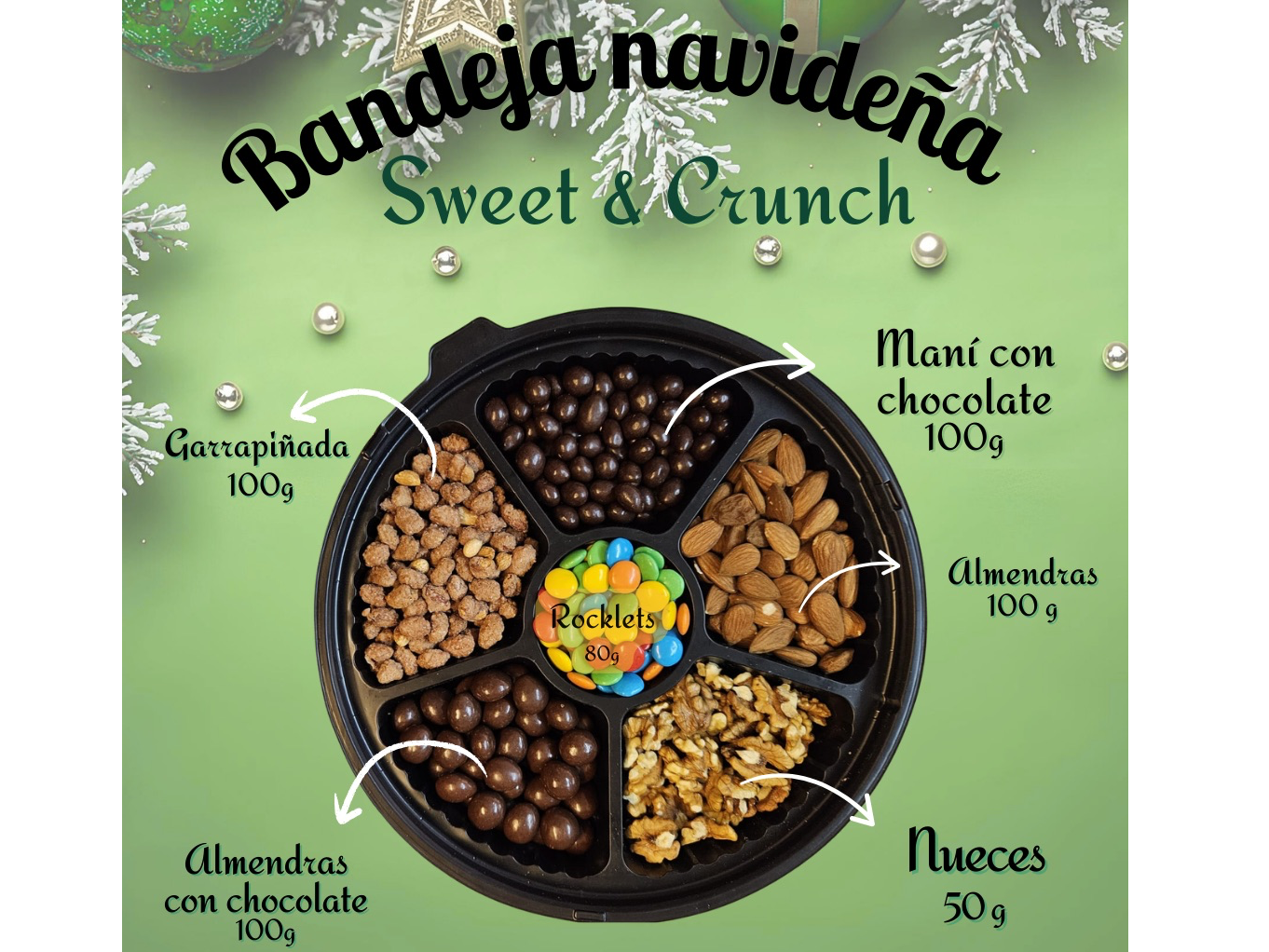 Bandeja navideña Compartir Contiene: almendras con chocolate, maní con chocolate, almendras, nueces mariposas blancas, Rocklets, garrapiñada. Presentaciones Seleccioná las opciones que quieras.1 unidad$12.0002 unidades$23.0005 unidades$57.000 Observaciones 0 / 150